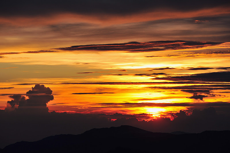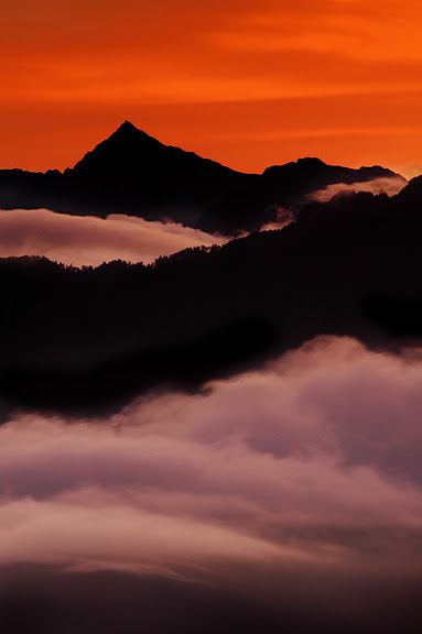 -- 天空著火啦 -- 趁著太陽還沒出來,爬上了合歡尖山,拍到了這張火燒雲的照片。照片中露出山頭的兩座山分別為南湖大山(左)與中央尖山(右)。
