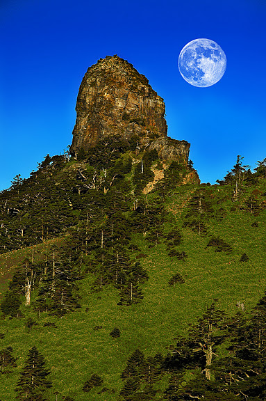 小霸伴月: 清晨五點,從霸南山屋往北走, 往上攀登300公尺來到大霸基底, 往西方望去, 一輪明月剛好依偎在小霸旁邊, 像是美女陪伴著英雄.