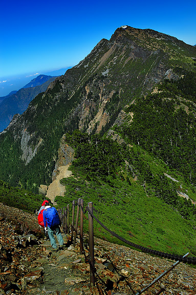 -- 勇闖惡地 -- 此斷崖路段是通往玉山東峰必經之地,崖壁垂直而下數十公尺,怵目驚心令人頭皮發麻,有懼高症的人鐵定手腳發軟。