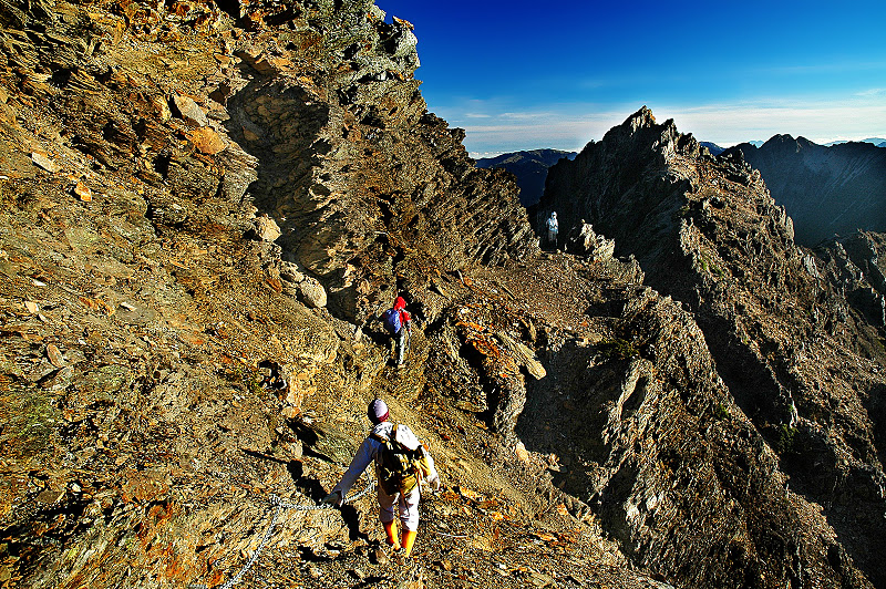 -- 干卓萬斷崖 -- 過了干卓萬山(3,284公尺)即是干卓萬斷崖,路徑都在稜線山頭上下,落差都在 50-100 公尺之間,並有四處峭壁懸崖,登山客必須拉繩索垂直上下攀登,危險性極高,需有強健的臂力與耐力方能通過。