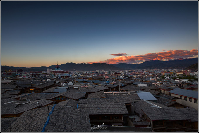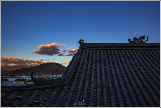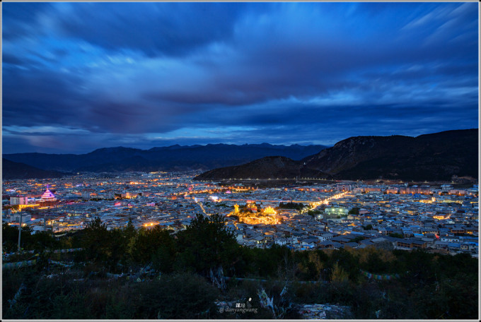 临近傍晚,我和荒野沿着滇藏茶马古道的石板路登上了独克宗古城(独克宗是藏语发音,意为“月光城”和“建在石头上的城堡”)后山顶上,那里有一座小小的寺庙叫白鸡寺,是当地人祈福的一个普通寺庙,虽不是出名的景点,但可以俯瞰整个独克宗古城,是欣常香格里拉市日出和日落的好地方。