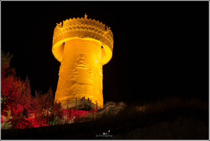 山脚下就是龟山公园,园内的大佛寺和世界上最大的转经筒在夜暮下闪烁着夺目的金光,透着庄严和神圣的不容亵渎的气息。