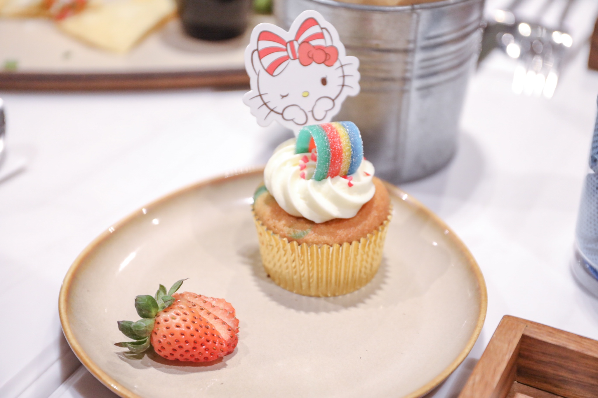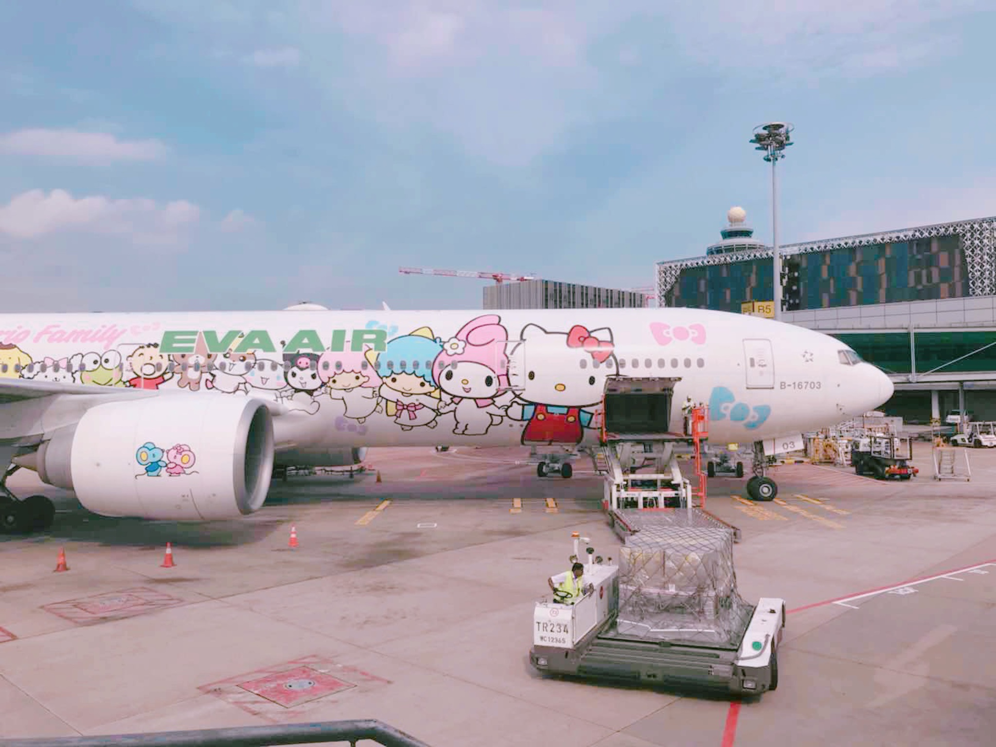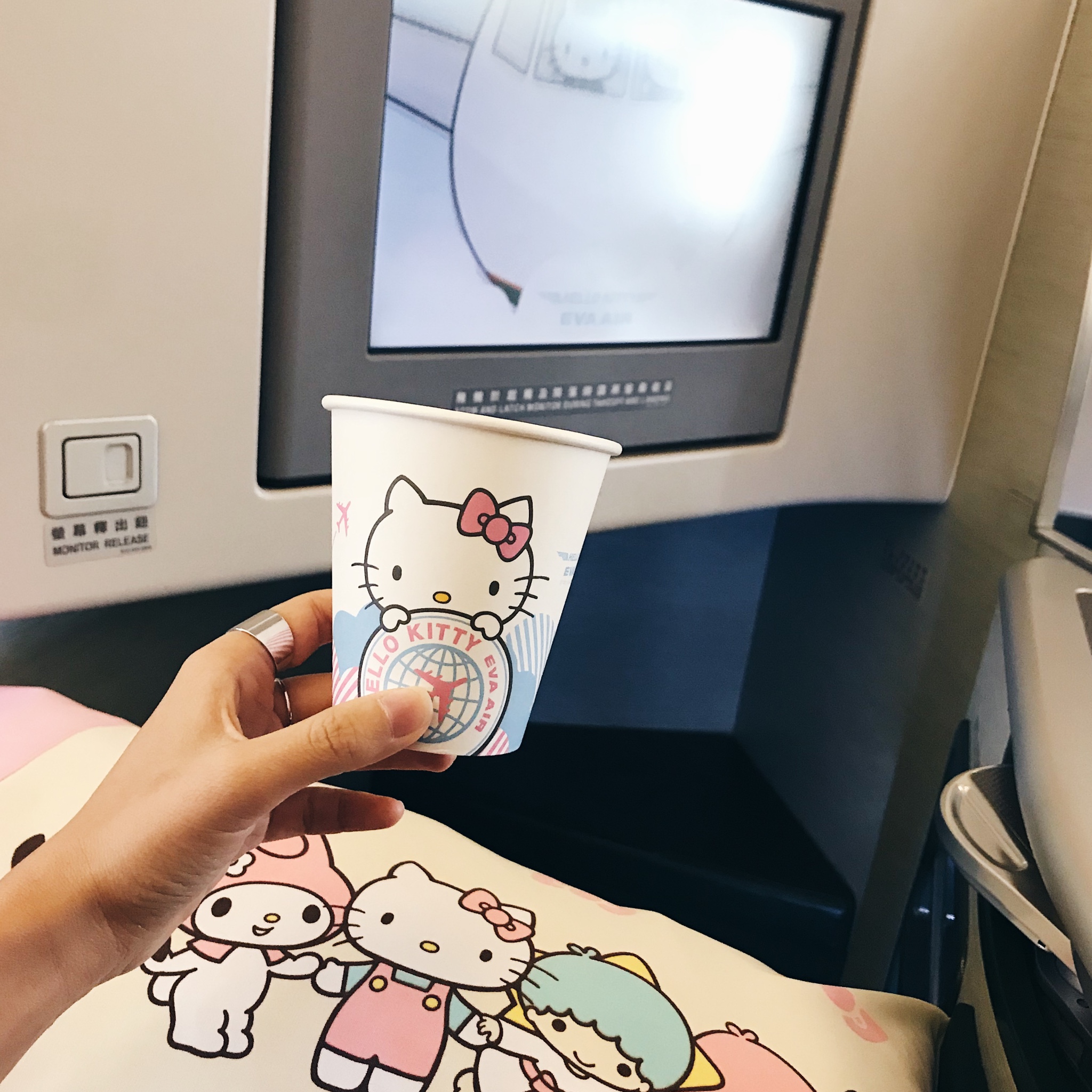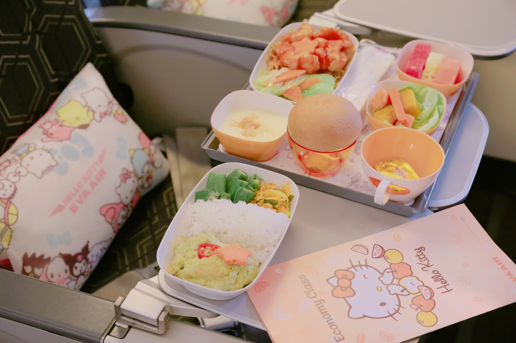 我到新加坡的那天是17号,听说长荣航空的Sanrio彩绘飞机会停靠在樟宜机场,很幸运能登机参观并一睹可爱的Sanrio主题机上餐食和舱内设施。在安检处看到集万千宠爱于一身的Kitty猫人偶过安检,跟随Kitty的脚步登机,整个机舱感觉萌萌哒,餐单、桌布、枕头、毛毯都有Kitty的设计,旁边有一位辣妈带着两个小女孩来参观,小女孩看到粉粉的餐具简直爱不释手。