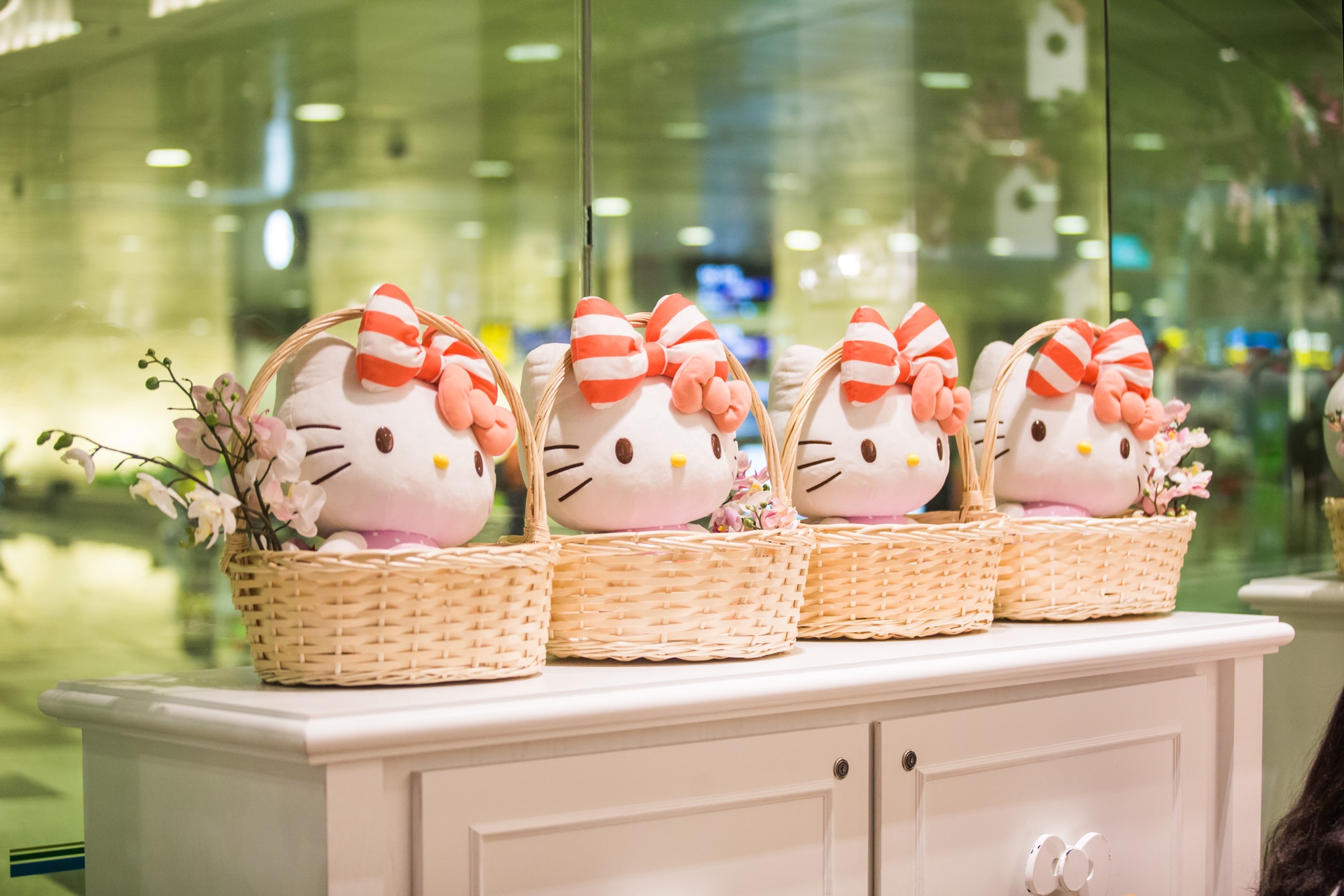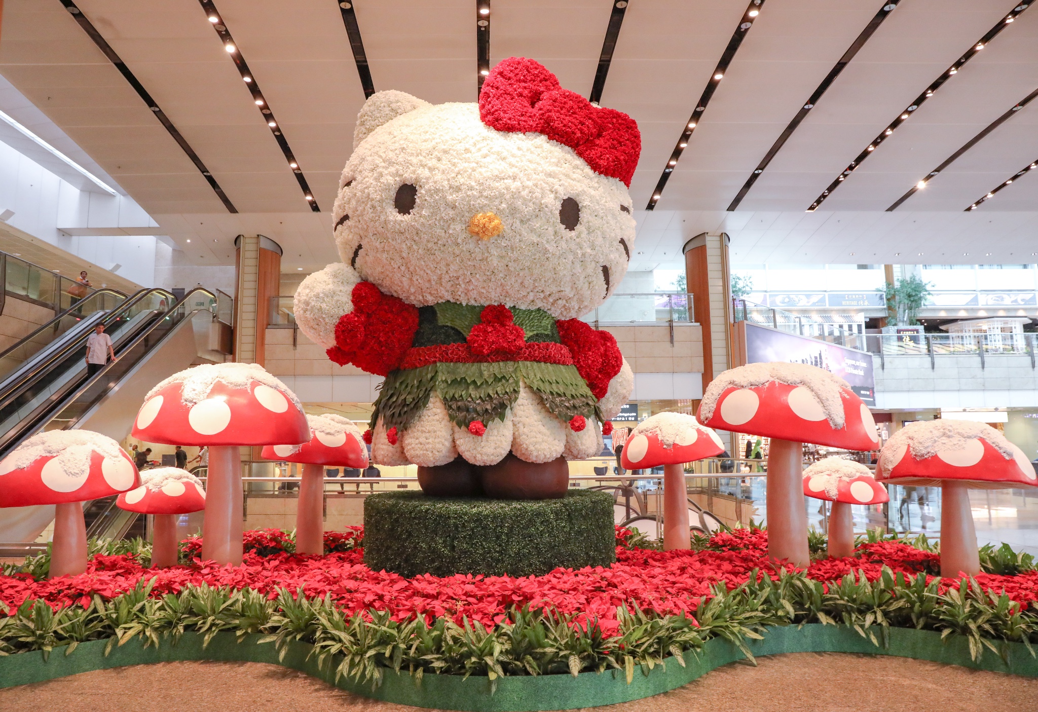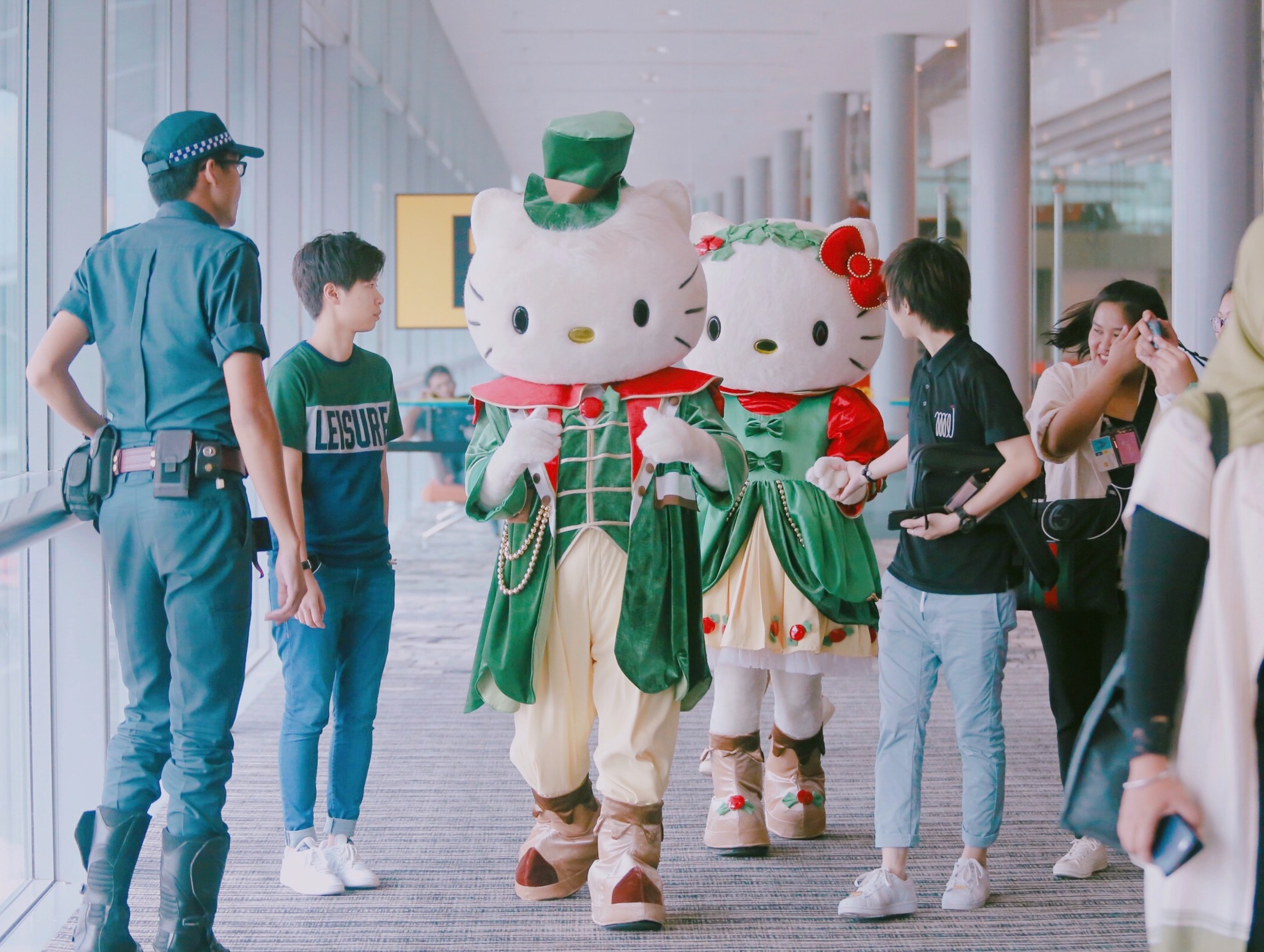 飞机降落,我在机场闲逛,整个机场被萌物包围,就像在游乐场一样。T2离境大堂有高达四米的巨型Kitty猫绿植,可以和Kitty猫拍一张最萌合影。
