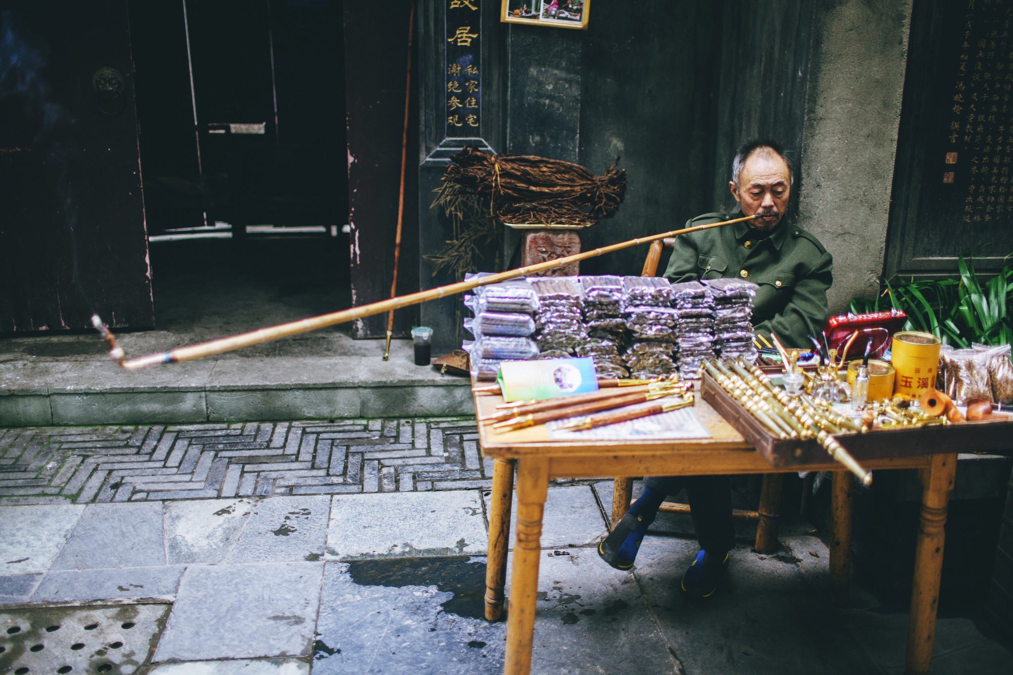 嘴中叼着烟杆儿的大爷,任凭经过的游客惊讶于他嘴中那极长极长的烟杆儿,发出多大的感叹声。大爷依旧是坐在椅子上一动不动,悠然自得的抽着烟,好像眼前的一切与己无关。不知谁问了句:“大爷,这个烟杆儿多少钱?”。大爷才扶下烟杆儿,慢悠悠的说出了价格。也不等问价的人是否买,又自顾自的抽起小烟来。
