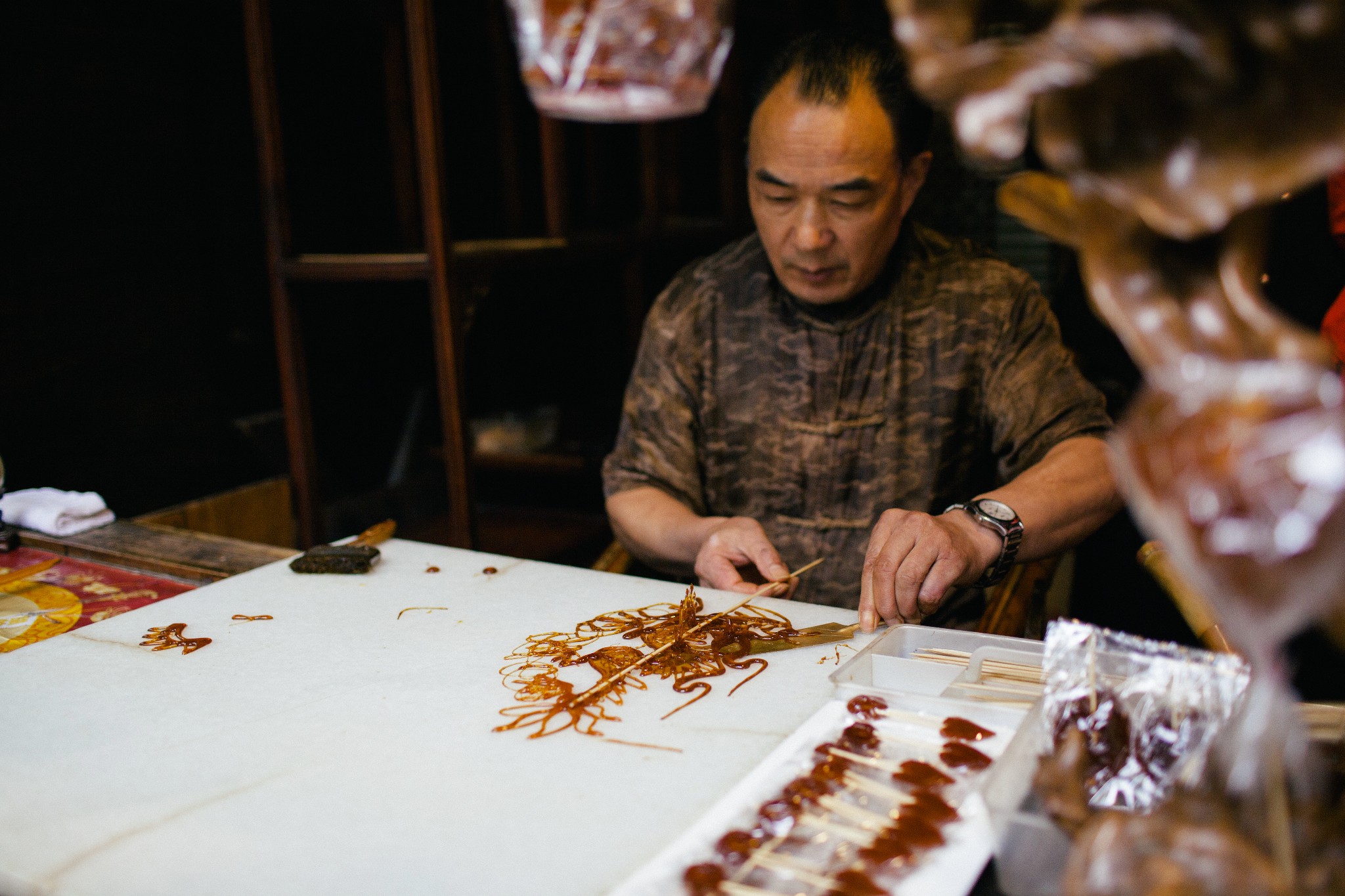 做糖人的师傅正在一丝不苟的游客做着糖人,桌子上放满了各式各样的造型。待师傅做完休息的功夫,我问了师傅做这行多久了。“二十来年吧。”一句轻描淡写的回答,让我佩服师傅高超手艺的同时,越发的觉得“匠心”二字不是说说而已。