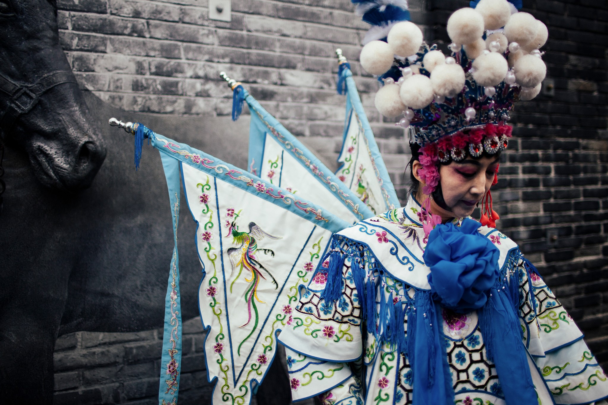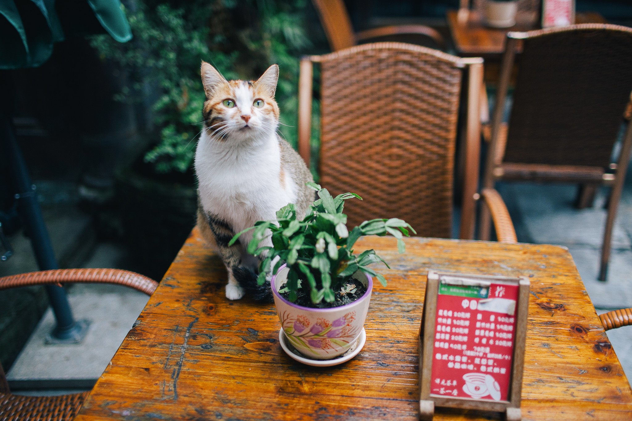 形形色色的人为宽窄巷子构建了一张奇妙的画面,拍婚纱照的新人,被众人的长枪短炮围拍的京剧扮相的阿姨...当然还有你,在桌子上喵语轻喃的小猫咪。