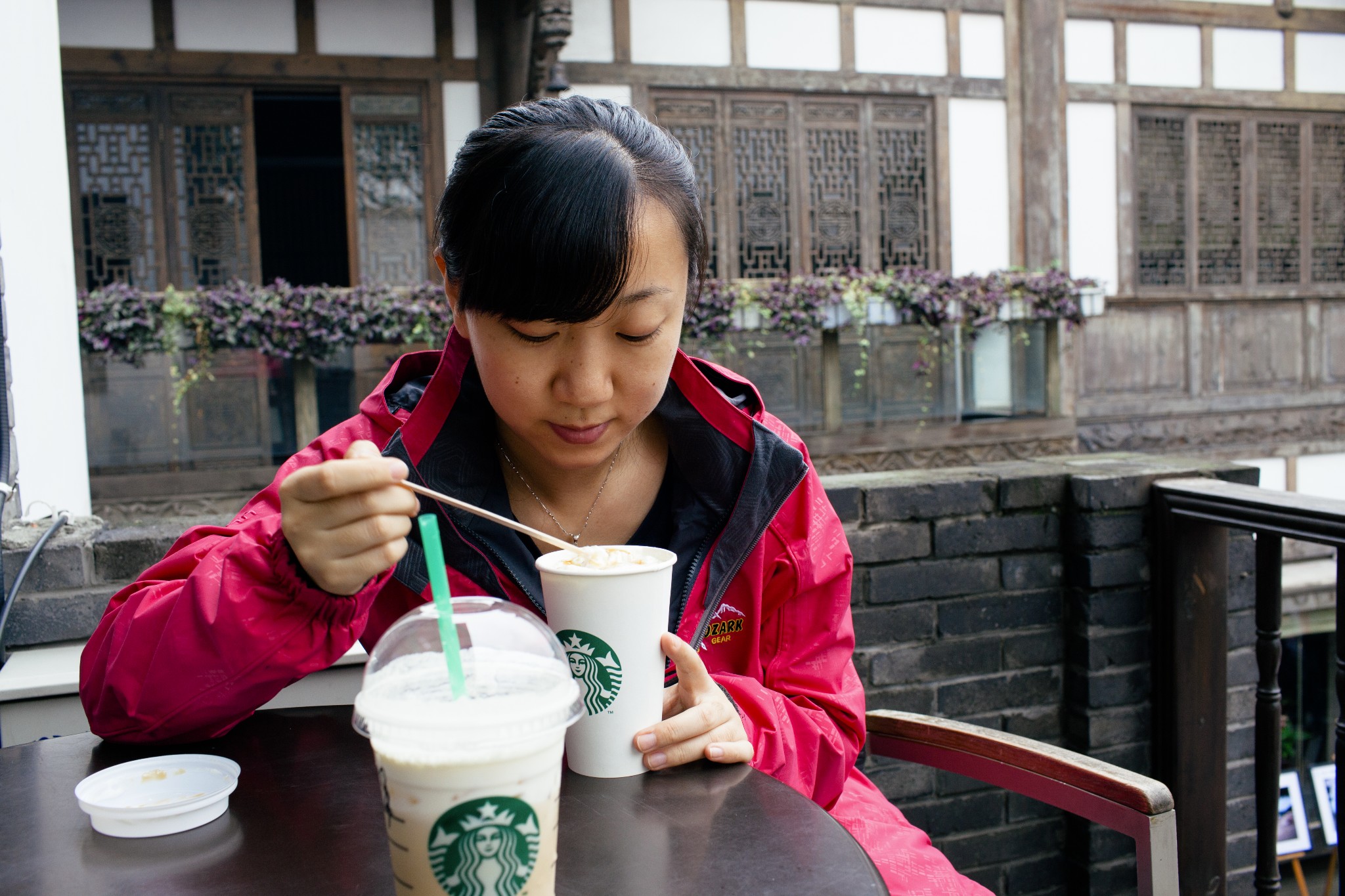 在宽窄巷子中的星巴克稍事休息,本想品品成都和北京的星巴克是否有区别,一本正经的轻抿了一口咖啡,砸吧了砸吧。哑然失笑,在下的舌头对咖啡并没有鉴别能力。和老婆轻声谈笑几句,随手用手中的相机记录眼前的景色,思绪也随意的发散着。