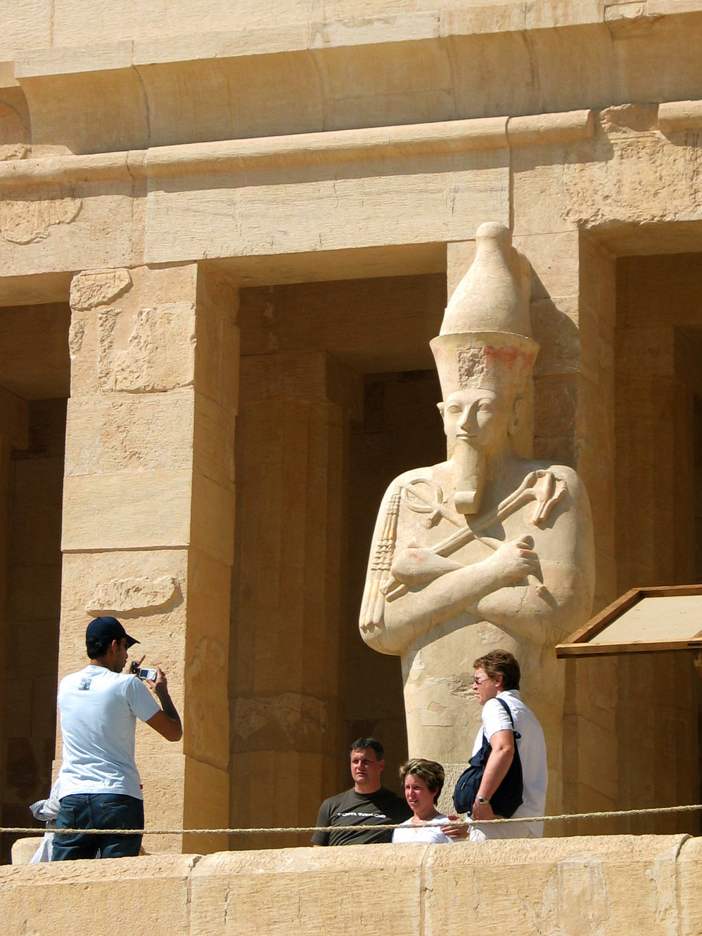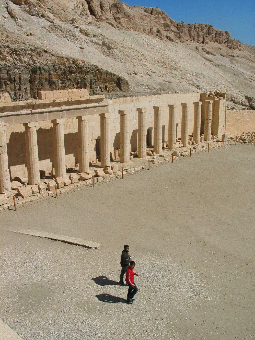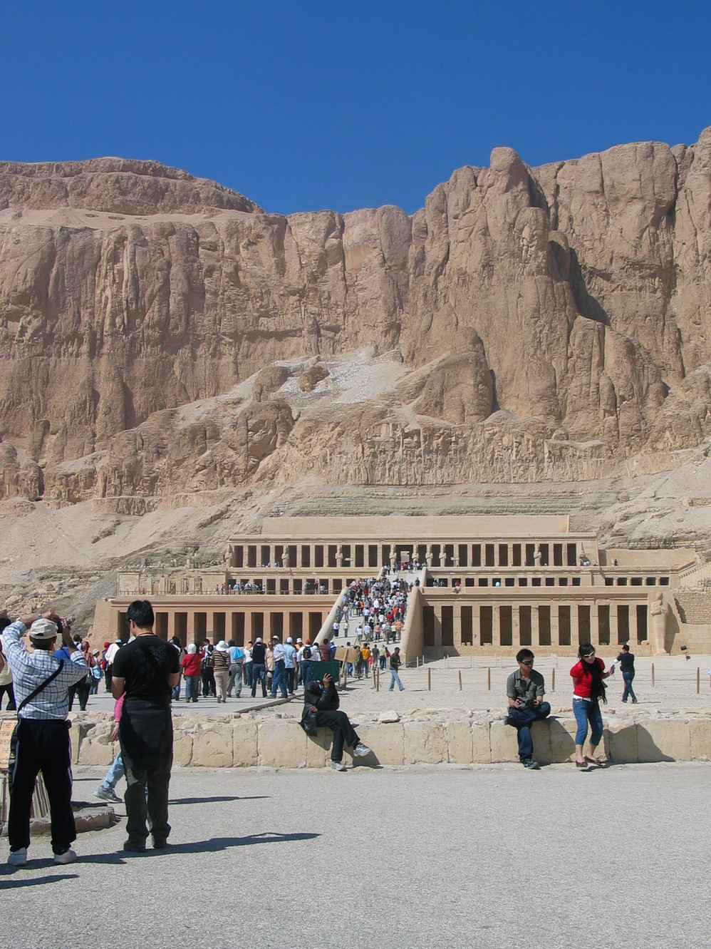 接着,到了女王殿,大老远就看到了一座依山而建的宏伟三层叠升式建筑,这就是女王神殿。这座神殿是世界最古老的楼房,它被世界公认为古代建筑中和自然景观交相结合的典范。 “埃及 本来是没有女王的,这个王后自称与太阳神有染得以掌权。她在这儿修了陵墓和神殿。神殿的周围山上有许多人在进行考古发掘,不少拿卡宾枪的警察在巡逻。神殿两侧的山上有很多洞穴,导游说这是当时修神殿的工程师、艺术家的墓穴。他还说,女王仁慈允许他们死后与之相伴,承其雨露。不像中国 的皇帝,将活人殉葬,将修墓的人活埋。这里墓道两厢的兽身人面像面孔皆毁。导游说,这里的人面本来多是女王面容,但女王为了权力将先王过继的干儿子流放海岛,后来没有办法,又把自己的女儿嫁给自己的儿子,希望能控制他。这个儿子(女婿)接位后非常仇恨女王,毁了神殿中所有女王的面相。”