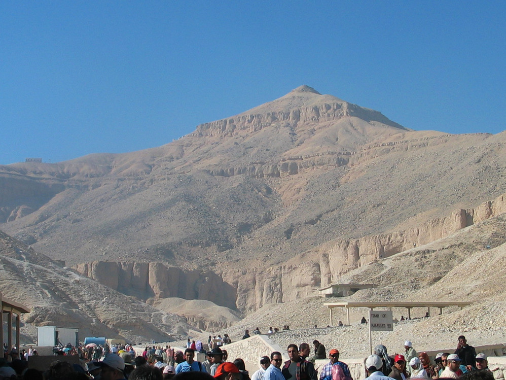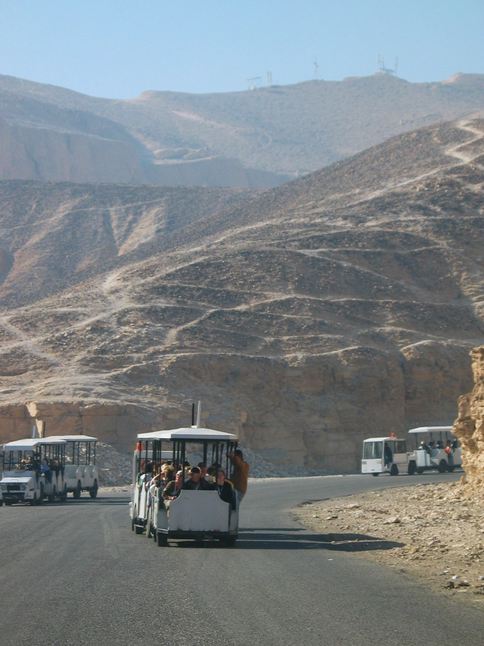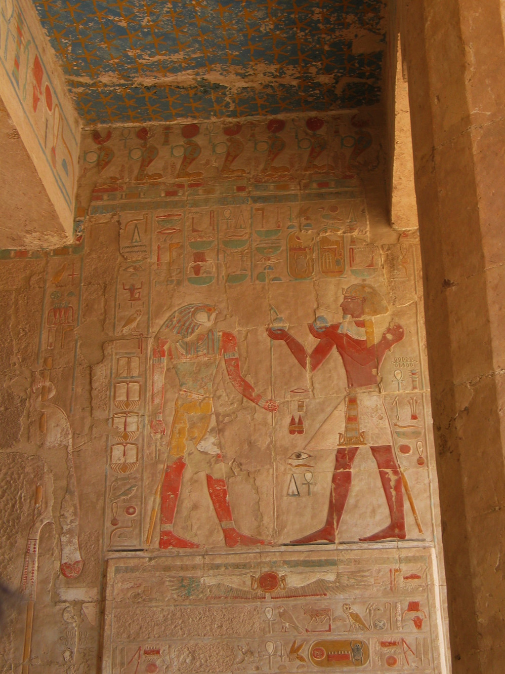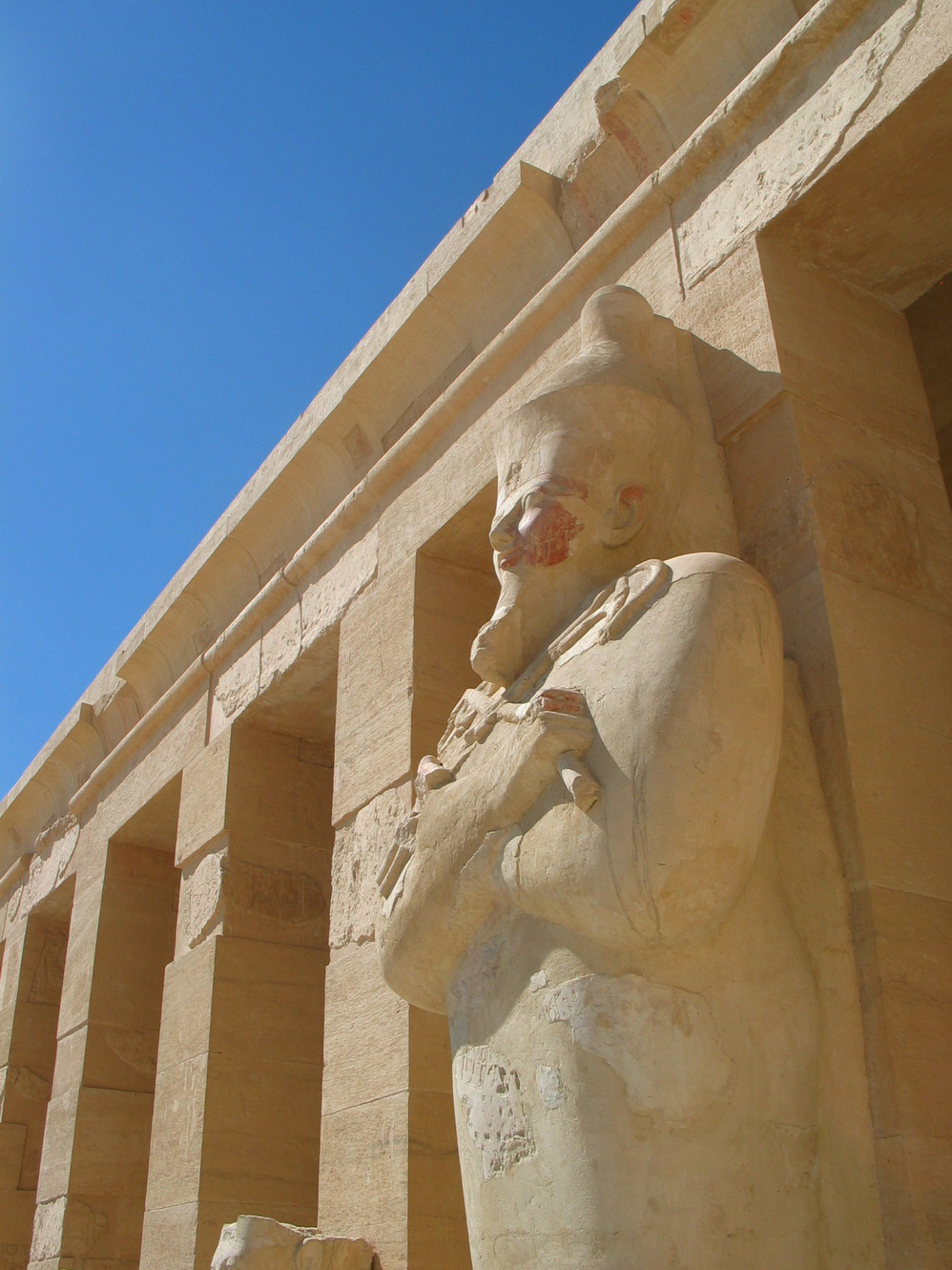 接着,到了女王殿,大老远就看到了一座依山而建的宏伟三层叠升式建筑,这就是女王神殿。这座神殿是世界最古老的楼房,它被世界公认为古代建筑中和自然景观交相结合的典范。 “埃及 本来是没有女王的,这个王后自称与太阳神有染得以掌权。她在这儿修了陵墓和神殿。神殿的周围山上有许多人在进行考古发掘,不少拿卡宾枪的警察在巡逻。神殿两侧的山上有很多洞穴,导游说这是当时修神殿的工程师、艺术家的墓穴。他还说,女王仁慈允许他们死后与之相伴,承其雨露。不像中国 的皇帝,将活人殉葬,将修墓的人活埋。这里墓道两厢的兽身人面像面孔皆毁。导游说,这里的人面本来多是女王面容,但女王为了权力将先王过继的干儿子流放海岛,后来没有办法,又把自己的女儿嫁给自己的儿子,希望能控制他。这个儿子(女婿)接位后非常仇恨女王,毁了神殿中所有女王的面相。”