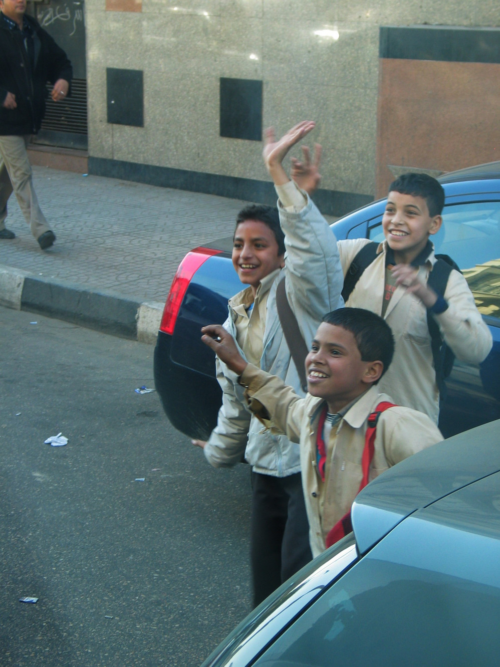 在去往埃及 博物馆的路上,小朋友在车外超我们不停挥手!