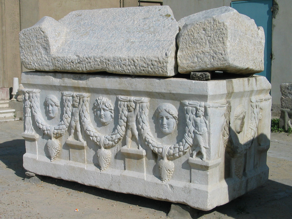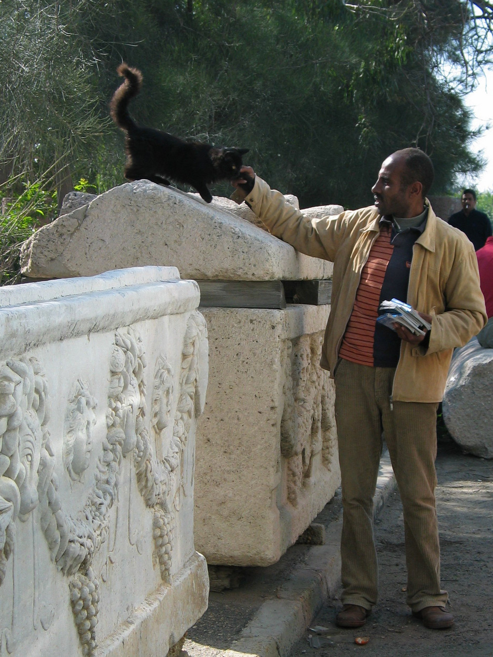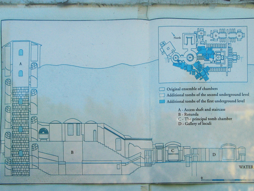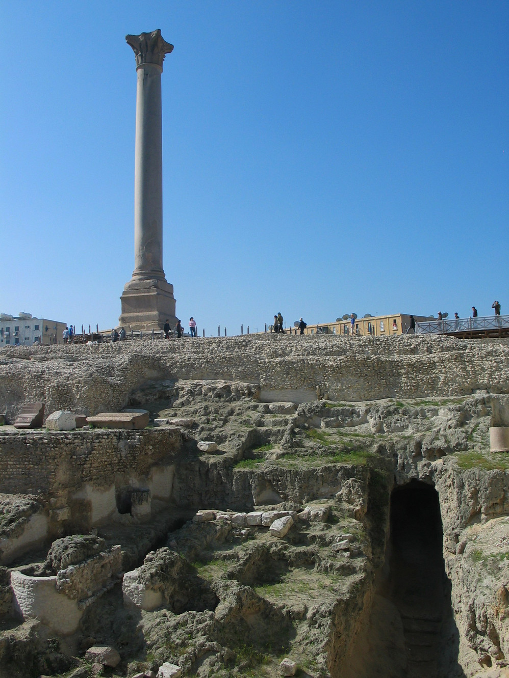 首先来到的是库姆 埃勒 ——舒卡法地下坟墓。Kom al-shoqafa地下墓地身处闹市,是一头毛驴突然掉进一个大坑,在寻找毛驴时发现的。它大约是公元1至2世纪时期的,规模巨大,约有200个墓穴。深约23米,分3层,入口是一个圆形的大井(死者的木乃伊是用绳子从井口放下去)。顺盘旋石阶而下,就到了墓室中央的一个大厅,此厅有柱8根;左手边是另外一个立柱大厅,三面都有大理 石的长凳,这就是所谓的“宴会厅”(为死者送葬之后,所有的亲友聚集在这里,开始一场的死亡的宴会,之后,要把盛酒的陶罐摔在地上)。网上说:罗马 人的生活似乎永远也离不开宴会。或许这正代表了他们对生活,对死亡的态度。墓地里面禁止拍照,拍了这个建筑图,应该很直观!