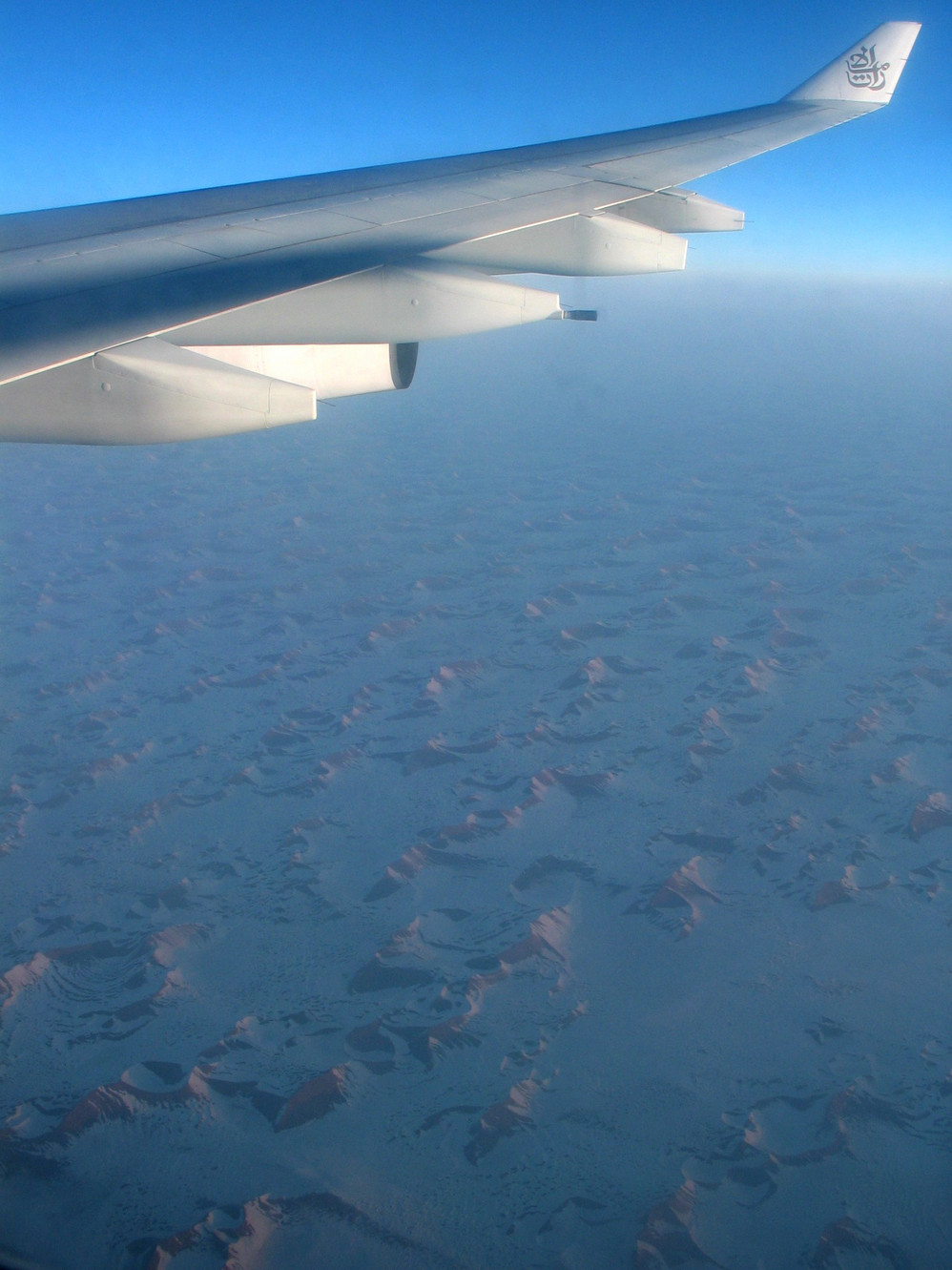 经过沙漠上空,看见覆盖了白雪皑皑的沙漠!自己一直以为只有骄阳似火“热情的沙漠”。