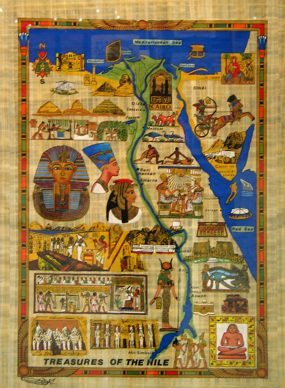 “在埃及 ,无论在机场,还是在旅游景点或工艺品商店,我们都可以见到这种特殊的画。画的纸张有些发黄,发皱,却柔韧有余,富有弹性;入画的有金字塔,埃及 古代的法老,也有各种吉祥物和田 园风光等,画风古朴,这种画便是堪称埃及 文化瑰宝的纸草画。”