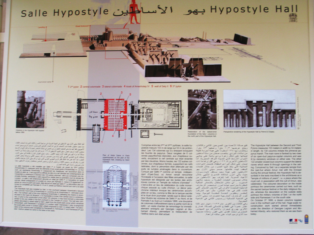 在众多柱厅中,最大的一座由十九王朝拉美西斯一世、谢提一世和拉美西斯二世三代法老鼎力修造,面积达103米×51.8米,共有134根圆形巨柱,中央12根最大,高23米,直径5米,柱顶呈莲花状,是古代建筑中最高大的石柱 。在门楼和柱厅圆柱上有丰富的浮雕和彩画,既表现宗教内容,又歌颂国王业绩,并附有铭文。这座神庙是研究中王国和新王国历史、文化的重要考古遗迹。