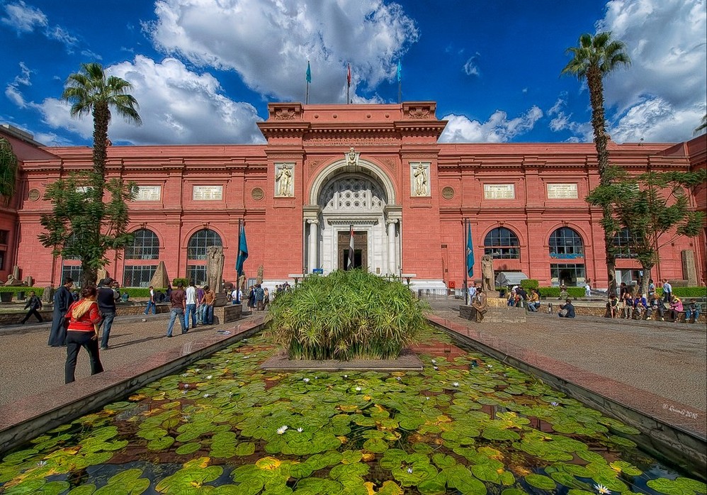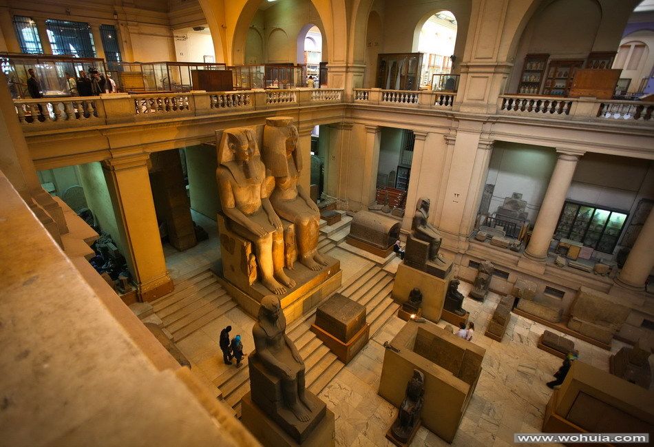 “埃及 博物馆是一座古老而豪华的双层石头/view/36375.htm(建筑物) ,是由被/view/107033.htm(埃及 人) 称为“埃及 博物馆之父”的/view/64741.htm(法国 ) 著名考古学家/view/167164.htm(马里 埃特) 于 1858 年在/view/19490.htm(开罗 ) 北部的布拉克设计建筑的。这个博物馆后又曾两次搬迁,1902 年迁至开罗 新馆。博物馆前面庭院内种植有代表古代上埃及 的“莲叶”和代表下埃及 的世界上最古老的造纸材料——纸草。馆内设有 50 多个陈列室。一层按埃及 古代历史发展顺序展出,在这里可以看到从古王国时期 (公元前 2686 年至公元前2181 年)到公元五、六世纪的罗马 统治时期的珍贵文物。古王国时期的展品以孟菲斯 为中心的北埃及 王墓出土雕像 为主,有卡夫 勒王座像,盘腿书记坐像,拉赫梯普国王及王妃民费雷特 坐像等。后者为石灰岩 着色像,仍保持了鲜艳的色彩。中王国时期 ,木雕逐渐代替石雕。陈列的彩色木雕士兵像、送祭品人像等极为精致。”