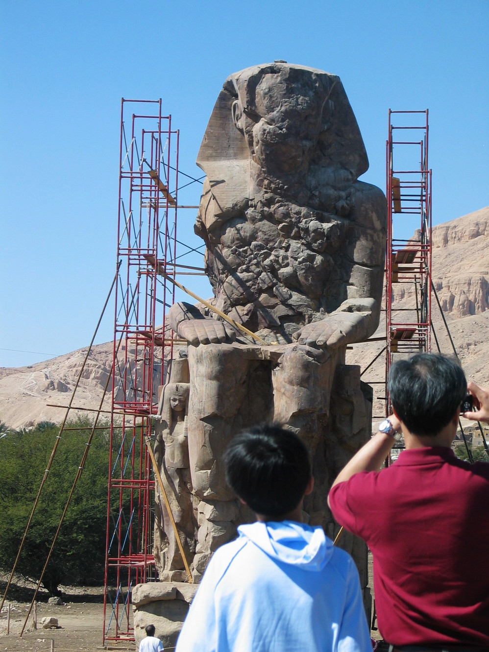 上面就是孟农神像,Amenhotep III(公元前1390-1352)修建的两个巨大石像。"过去一尊像胸口有个洞,风吹过时有声音。后来罗马 人多余的把洞填上了,石像就没有了声音,埃及 人说这法老自此没有了灵魂。"石像很斑驳,几乎看不清法老的相貌。面对这样斑驳的神像,大家在这里随便拍了下外观,不到10分钟,就上车走了。