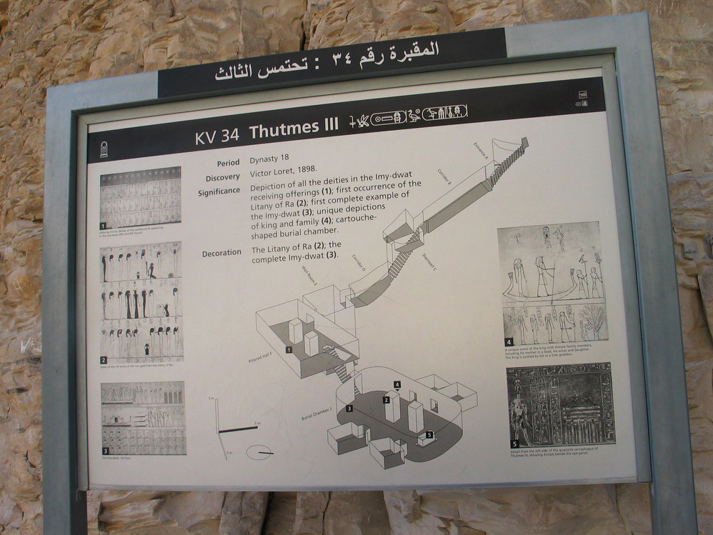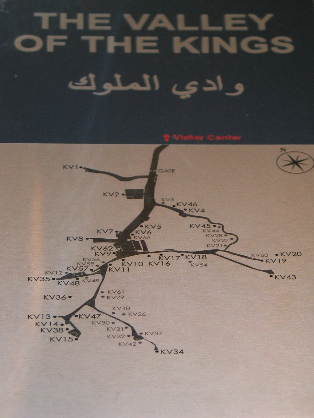 墓穴入口往往开在半山腰,有细小通道 通向墓穴深处,通道 两壁的图案和象形文字至今仍十分清晰。这里所有的墓都建于新王国时代。从地面沿台阶向下走,经过前室,就到了安放石棺的墓室。第十八王朝的墓的特点是前室和墓室成直角,而到了十九王朝之后,大多成了直线式的了。国王谷一共发现了60多处墓地,现在对外开放的墓地仅是其中10处而已。