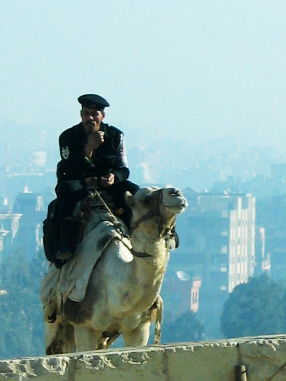 到了金字塔景区,它是在郊区的高地上,可以俯瞰整个开罗 城区。原来警察都是骑骆驼!