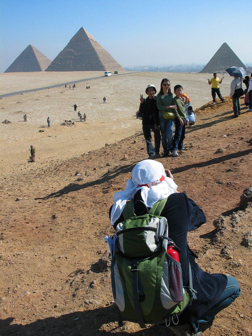 接着,他向我走过来,指着20米外一个地方,说,你要在这里照效果更好。他的微笑很真诚,他说你们朋友都走远了,我帮你照吧,你看他们都在这里照,效果很好。我看了看他手中拿的以前游人的照片,的确可以看到吉萨 塔的全貌,心里完全没有戒备,就一同走去。