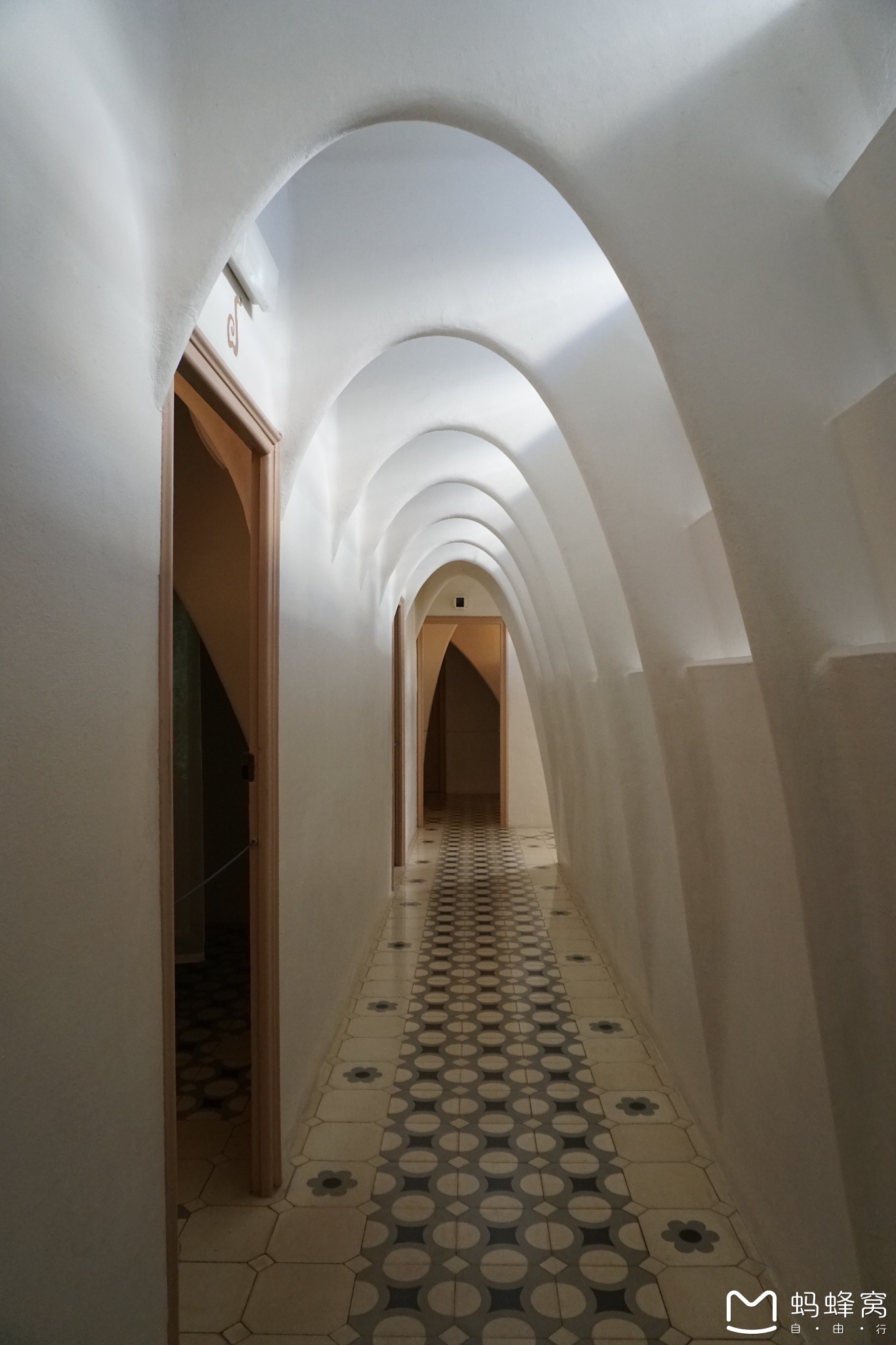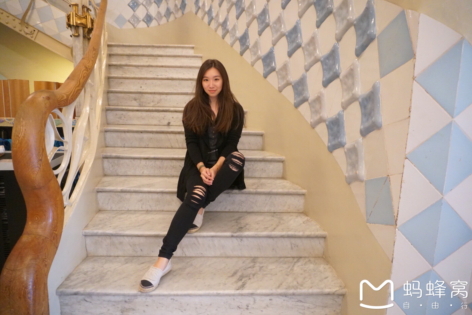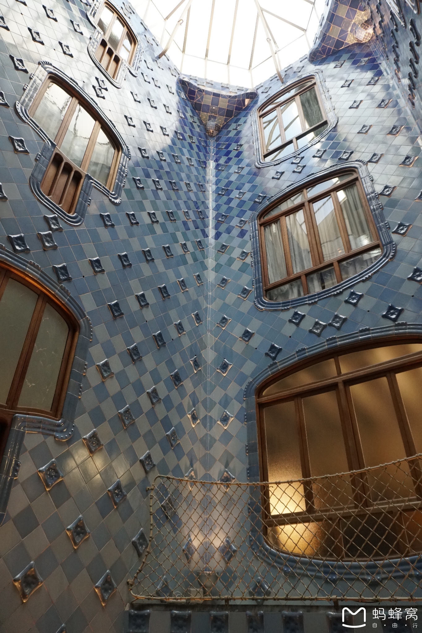 因为买的是早班票加现在不是旅游旺季,参观的人不多。巴特罗之家本身对外开放的就是一楼和顶楼,还有一点花园空间,所以如果不是专业来摄影的,快则半个小时,慢则一个小时也就浏览完了。其实更多的是探索和感知高低的曲线空间-扶手,栏杆,楼道,门框,所有的一切都是曲线。一般来说我们会觉得直线代表简约,但看完高迪的设计,我倒不觉得凌乱,好像在色彩色块搭配和碎片处理上,他认真地跳过了简约,又小心的避过了让人眼花缭乱的复杂,对于我这种并不是专业的典型游客来说,他的巴特罗之家华丽、独特、新奇、又别致的恰到好处。