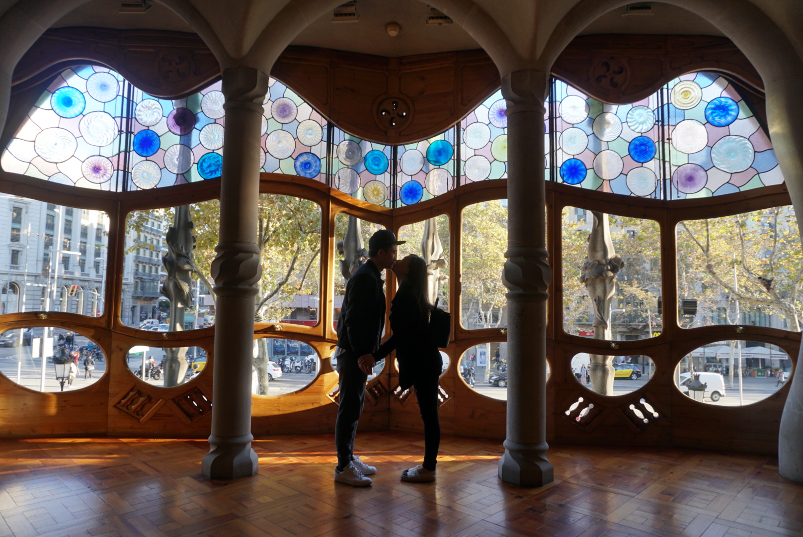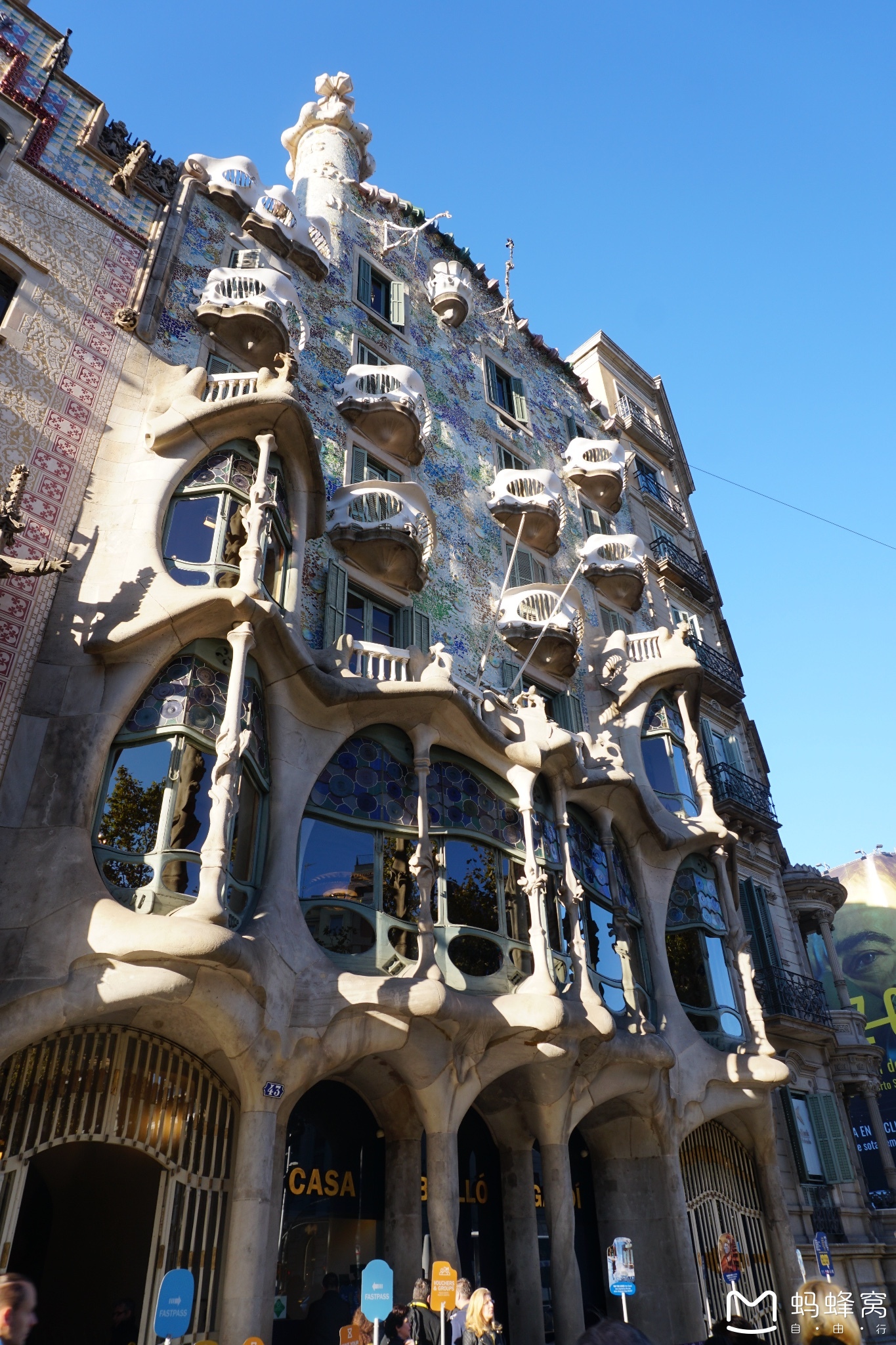 前往酒店存储行李后,我们赶到了巴特约之家。一位美丽的公主被龙困在城堡里,加泰罗尼亚的英雄为了救出公主与龙展开搏斗,最后用剑杀死了龙。龙的血变成一朵玫瑰花,英雄把它献给了公主。巴特罗之家的灵感就来自于这个故事,每一处设计都有着特殊的含义。十字架形的烟囱代表英雄,鳞片状拱起的屋顶是巨龙的脊背,镶嵌彩饰的玻璃和构思独特的阳台则是面具,在阳光的照耀下色彩缤纷。