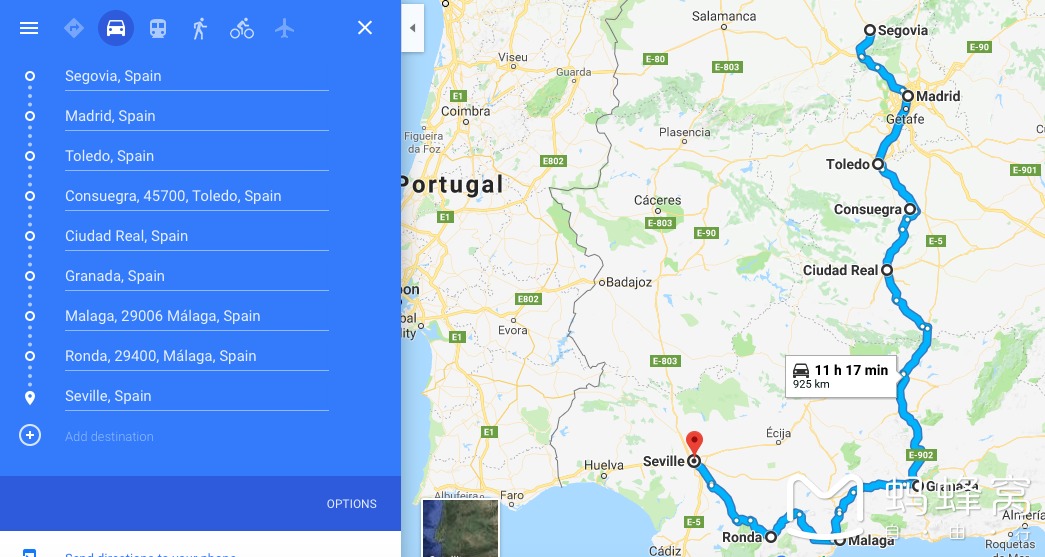 Goolge Map附上,其中巴塞罗那没有自驾游,所以不在图里。seville还车后坐飞机到葡萄牙里斯本,后在里斯本租车自驾游,所以也不在图里显示了。