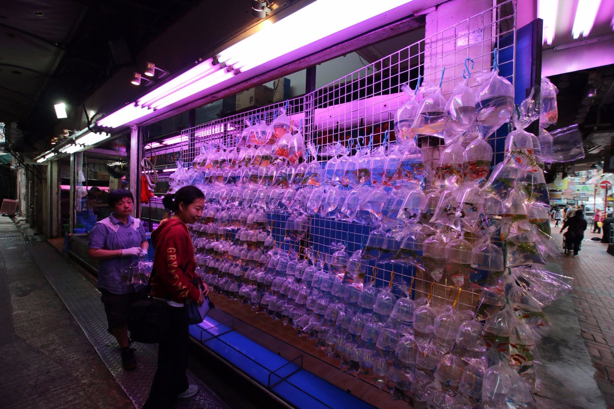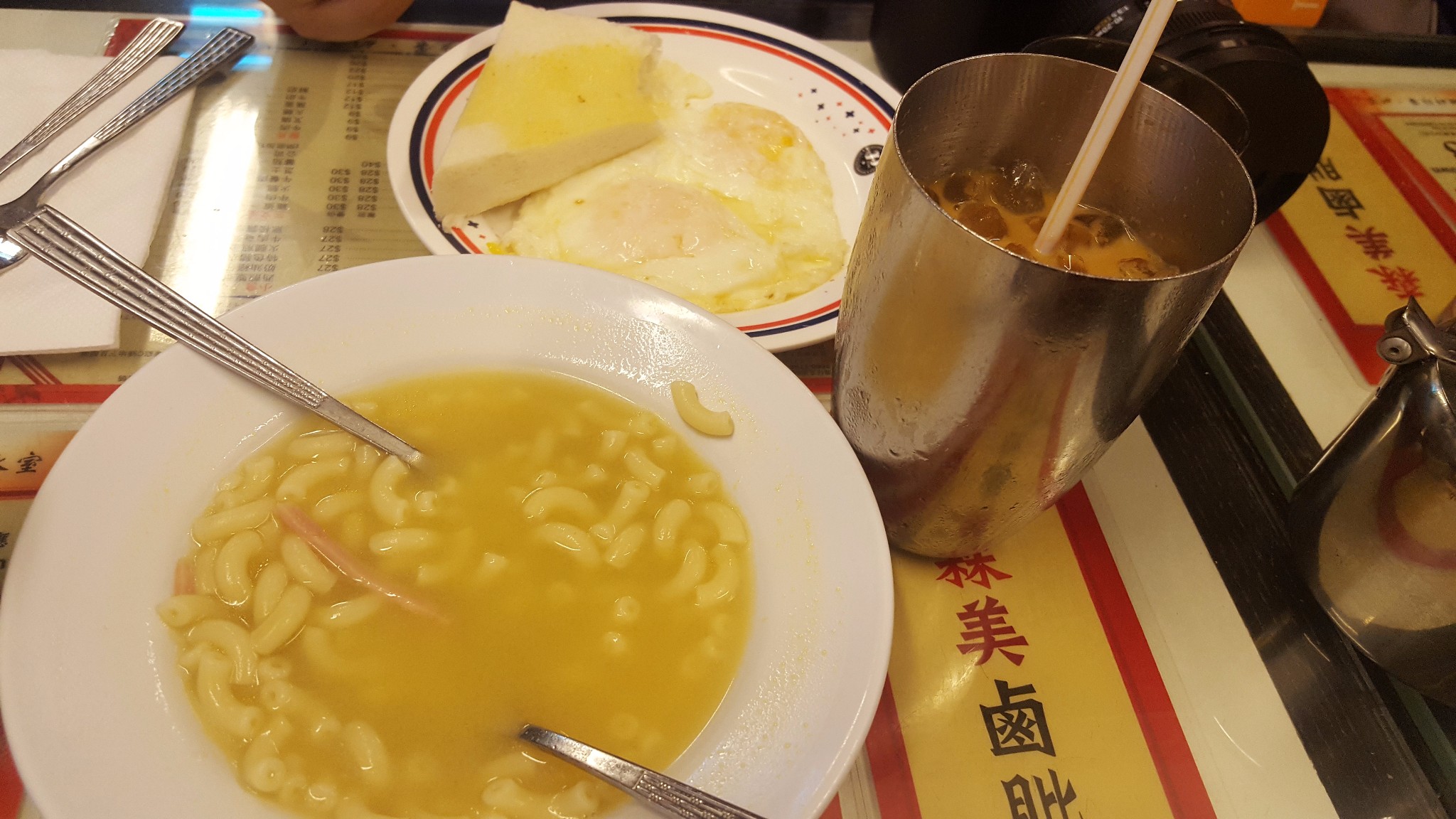 满意的吃完早茶,又没到酒店入住时间,我们就开始来旺角行(hang)街了,香港不愧为旅游城市,街头巷尾的大小景点指示牌都标记的很好,没有手机地图也可以轻松找到。因为来香港之前换的一点港币已经花的差不多了,我们来到花旗银行的ATM取港币,汇率7.6HKD/USD。后来才知道汇率来讲,信用卡(7.8)>当地现金换汇(7.7)>ATM取现(7.6)。当地现金换汇的汇率差别也很大,多看看不难找到好的换汇点。逛了逛旺角金鱼街(其实也就是几家袋装卖鱼的金玉铺),狗仔就渴了(狗仔每天都渴ε=(´ο`*)))),本以为香港满大街应该都是奶茶店,发现要喝奶茶还得去茶餐厅。金华冰室人满为患,我们来到华星冰室,发现单买奶茶不如买早餐套餐划算,我们就毫无压力的再吃一顿早餐好了。两人分一份早餐套餐,标准港式早餐,一份肠仔通心粉,一个牛油吐司,两个煎蛋(店员小哥态度寡淡,也没问我们煎蛋还是炒蛋),一份冻奶茶。吃完第二顿早餐,走出冰室,才九点半,外面已经悄悄排起了长队,不少看起来像本地人,不禁感叹香港人真的有耐心,吃个早餐还要排队。