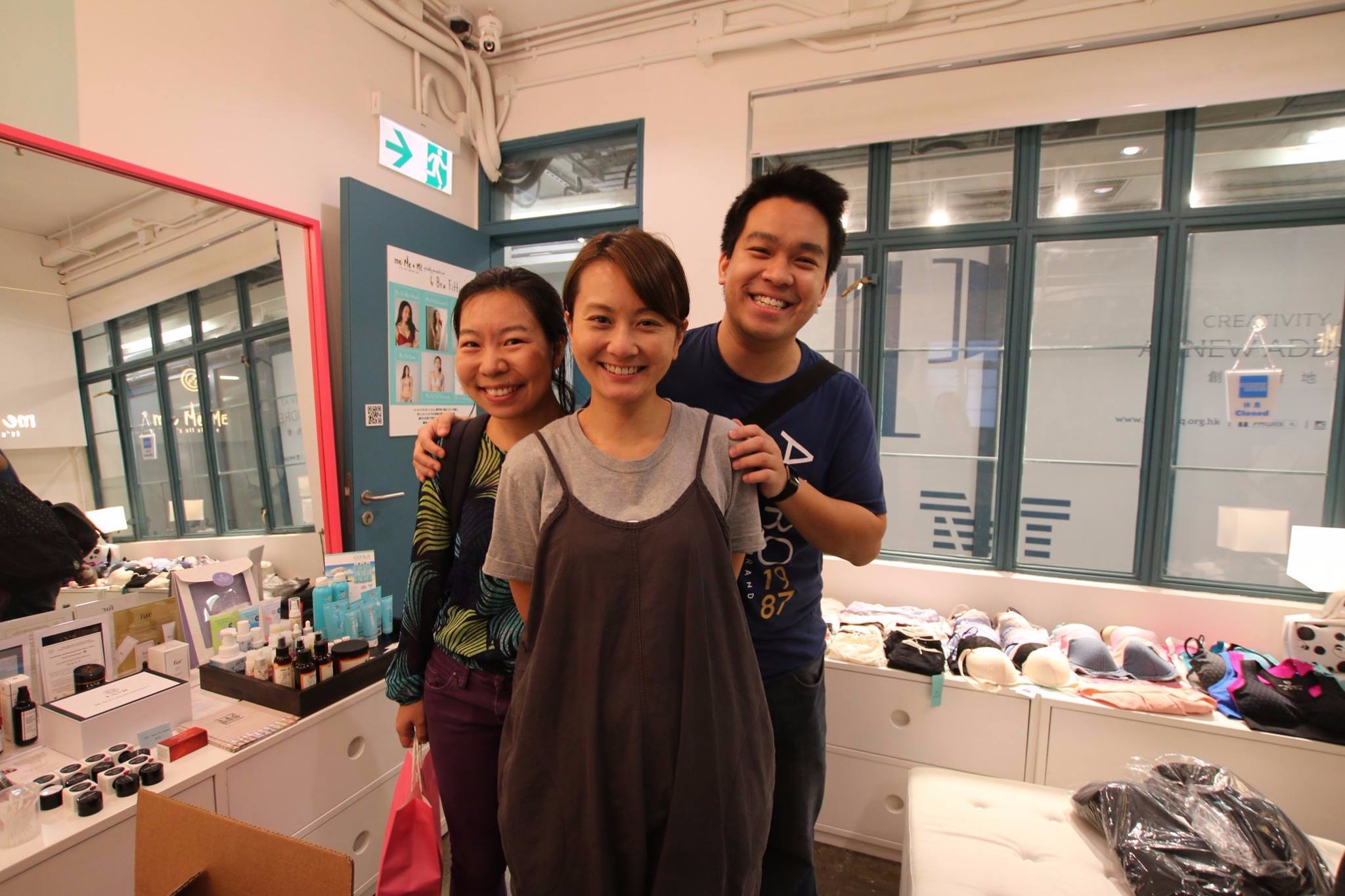 匆匆吃过午饭,在狗仔的强烈要求下,第二站便来撞星。之前在蔡澜叹名菜上认识客串主持黄宇诗,后来又在HKTV的璀璨之后上看到她离开荧幕前开启了自己的内衣品牌,我们就决定来她的店里支持一下她的生意。来到她PMQ的内衣店Me,Me & Me,店员小妹迎上来,本以为她不在,不一会便听到熟悉声音从后面小房间传来,原来她在做电话采访,过了一会买好东西,她正好出来了,我们抓紧机会,小粉丝崇拜状迎上,谁料宇诗也很激动,主动要求和我们合了影!