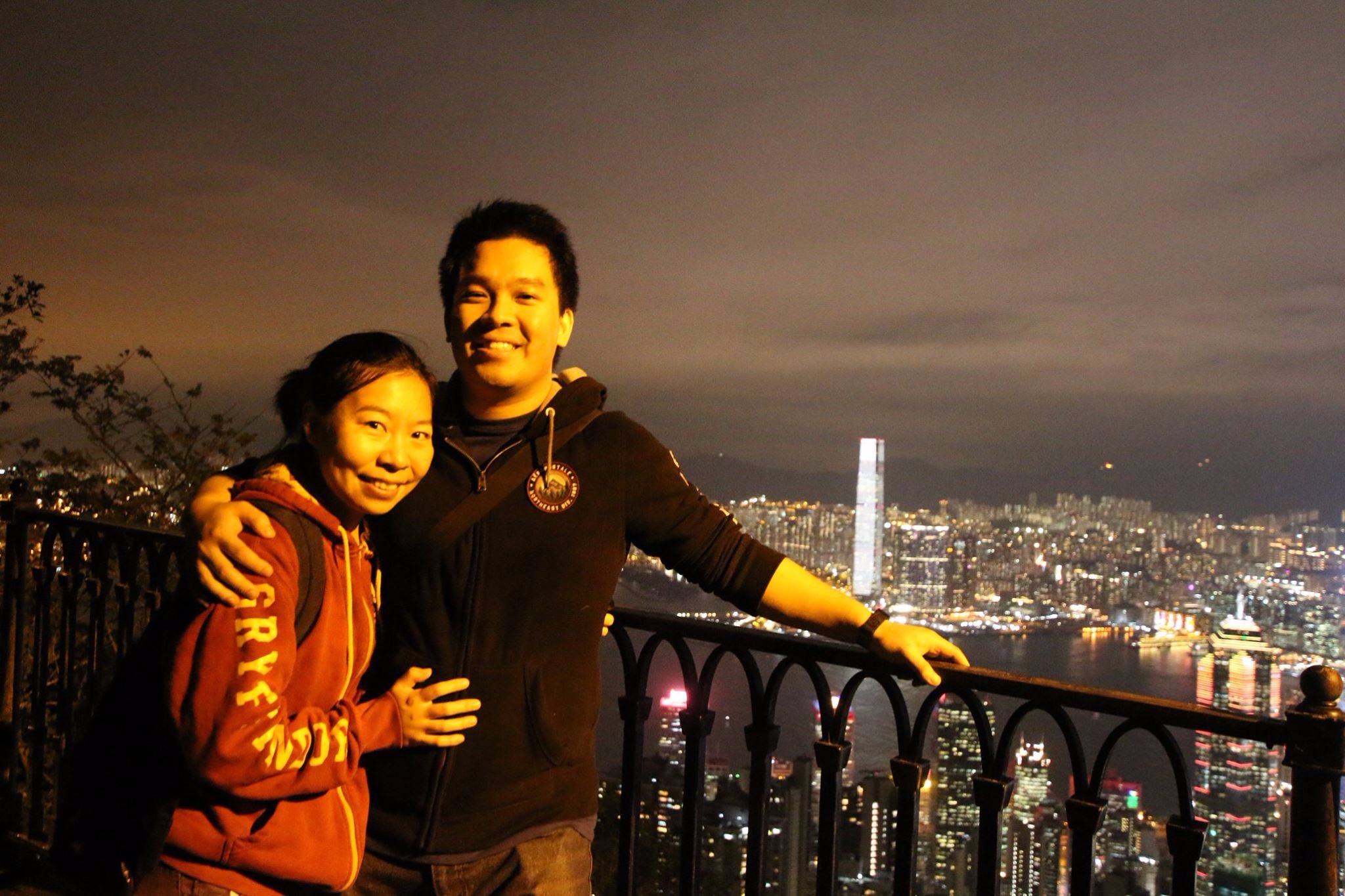 经过了陡峭的Central Green Trail和Barker Road,历时一个半小时,我们终于爬到了山顶。不出意料,我的狗仔已经阵亡,只能坐在椅子上等我给去给他买佳得乐。经过再三鼓励后,狗仔终于同意和我再走二十分钟平路去另一侧的卢吉道观景台。观景台上看到中环大楼亮起的弥红灯衬着璀璨的维多利亚港,感觉不旺爬上来的陡峭山路。