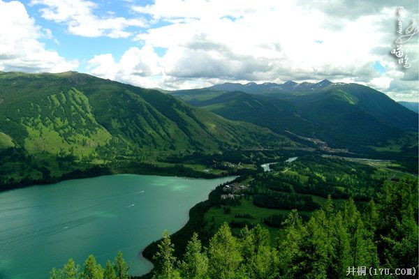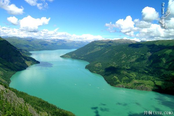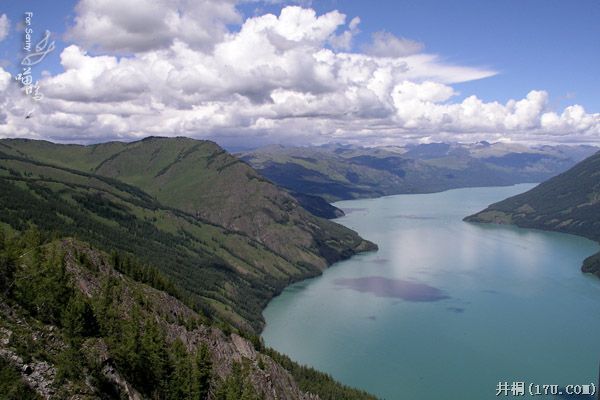 站在观鱼亭(/poi/7693630.html)上,拍喀纳斯湖,这是水域开阔的左边。湖面上是云的倒影,那几个肉眼几不可见的白点点是快艇