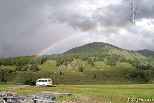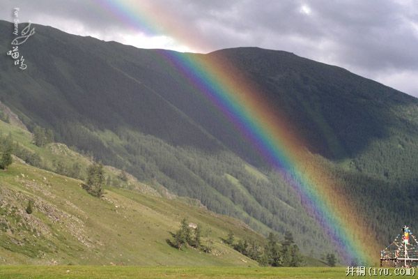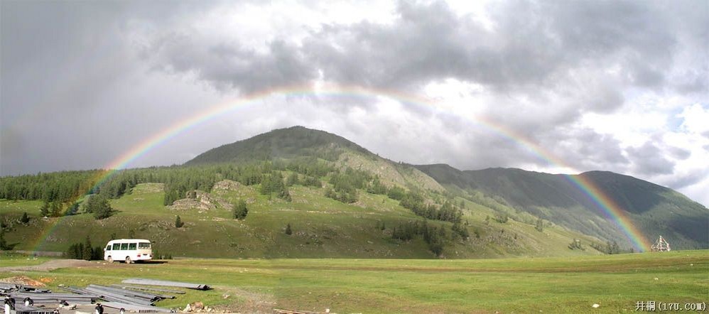 我的角度拍不到整条彩虹,这张图是我拍了2张拼的,哈哈。漂亮吧?彩虹刚刚跨过山头呢,一头还在类似蒙古包架子边上
