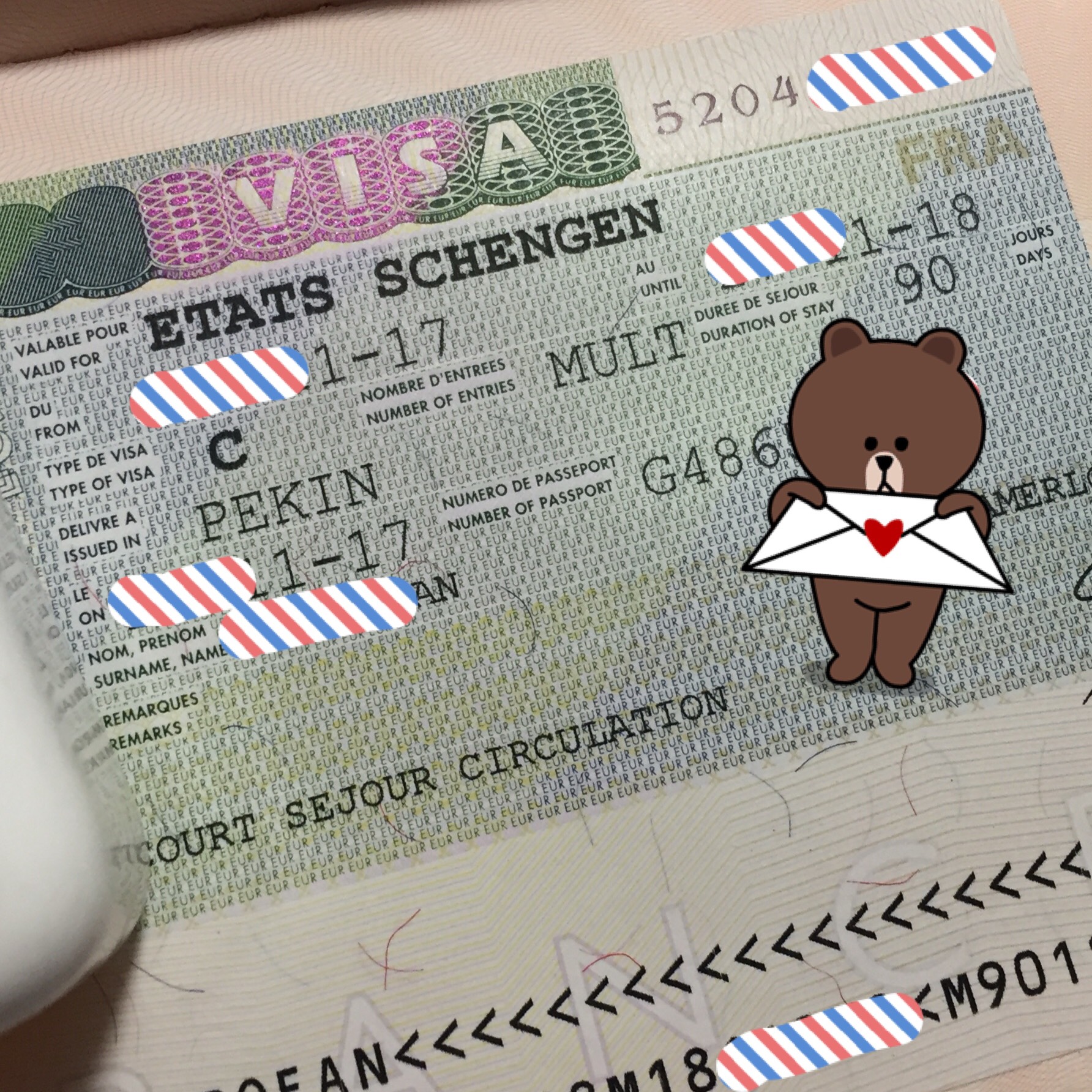 4.周四收到EMS寄回的护照。每个人的护照分别封在信封里,打开,顺利得到一年多次签证,旁边页钉着一张说明,提示入境时需要准备的材料。信封里有签证费的收据。