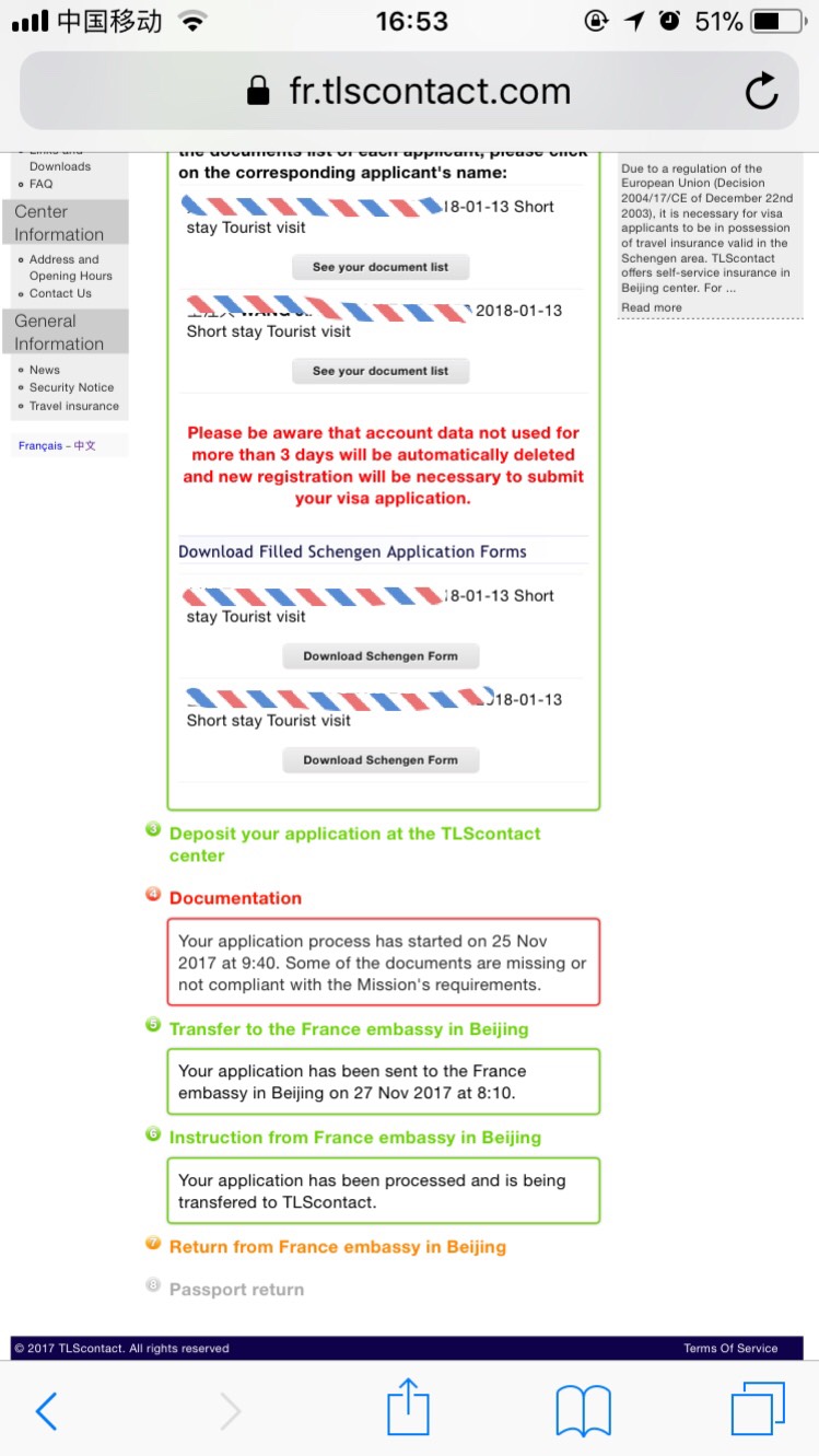 在离开签证中心后一小时左右,收到邮件,签证申请即将送往大使馆,同时中智网站进度Transfer to the France embassy in Beijing(Pending)。周一早上,Pending变为Finished,同时Instruction from France embassy in Beijing和Return from France embassy in Beijing变为Pending.