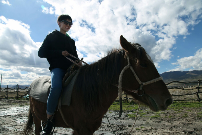 两位男子汉自己骑,我害怕所以让牧民牵着走,骑个马刺激的不行