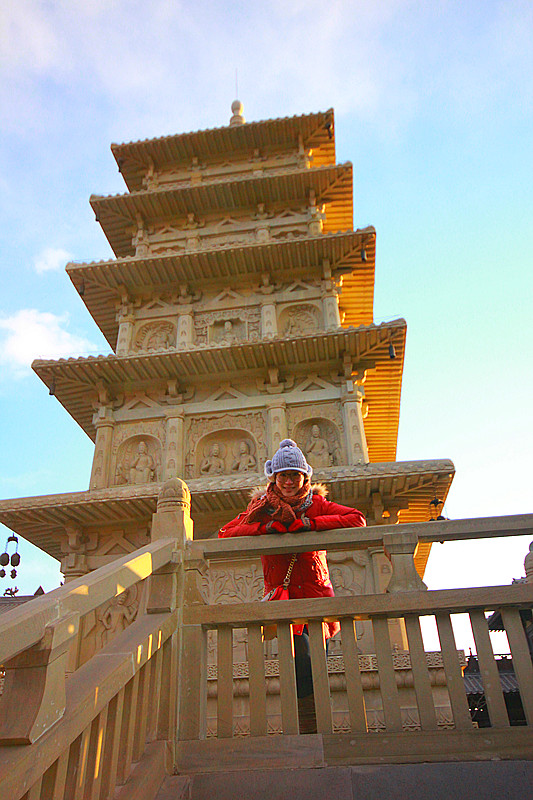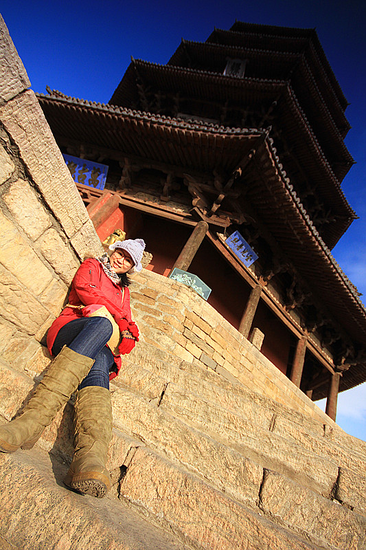 和两位女伴接头,坐上包车,第一站直指应县 木塔.这座辽代全木质高塔除了其无钉结构外,最重要的是内部珍藏的佛牙舍利.初看木塔被它的气势所震慑,不同于开封 铁塔宋朝式的”瘦弱”,它继承了辽人的粗狂与霸气,同样孤独地矗立在那儿,却给人不同的感受,值得细细品味.可美中不足的是,后方寺庙内僧侣的欺诈行为玷污了佛的慈悲,让我俩深恶痛绝.