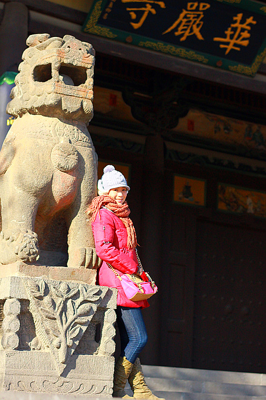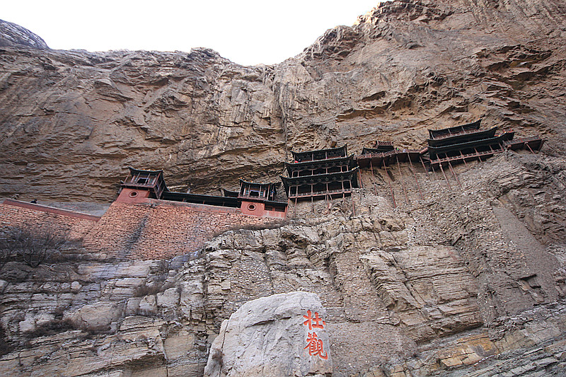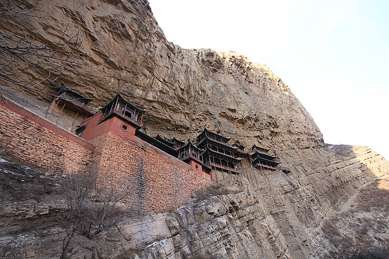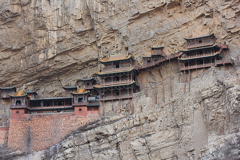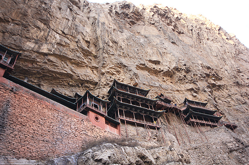 逃离应县 ,逃离那取缔不尽的欺骗,第二站是中原一绝:悬空寺,它是恒山 最大的亮点.刺骨寒风是对我们最热情的迎接.虽然是淡季,悬空寺仍坚持着它的绝唱.狭窄的楼道只供一人通行,高处不胜寒,越往上越能享受狂风的肆虐,贴着围栏向下观望令人胆战心惊.只有在真正面对它的时候你才能深刻体会到壮观的含义.下了古寺,在大风不停地催促下,快速回到车内,暖和的车厢和外在的寒冷,就如冰火两重天.其实我很感谢淡季,它能让人享受难得的清静,可气温实在是不敢恭维.
