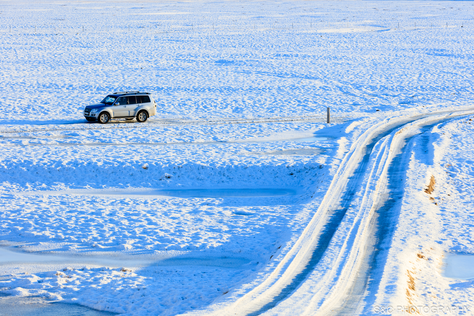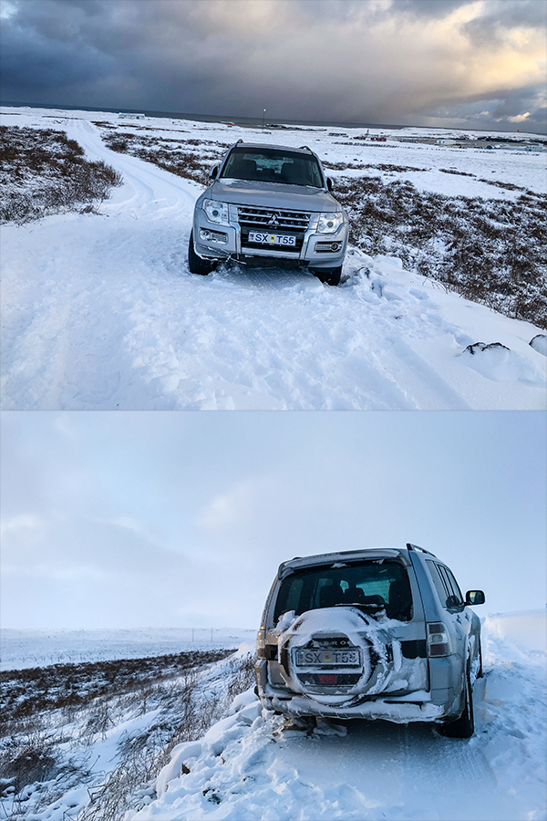 BUT!!!这种路况在冬季的冰岛只是奢望,另一个极端是这样的,如果没有指示杆和车胎印,还能看到路面吗?对于第一次开雪地的我们,绝对是一种挑战?你敢不敢?幸亏在 租租车 上 租车 的时候早已买了超级全险,但也是提着心吊着胆开。