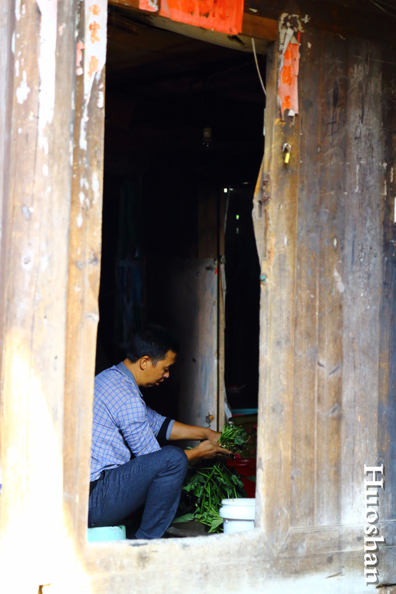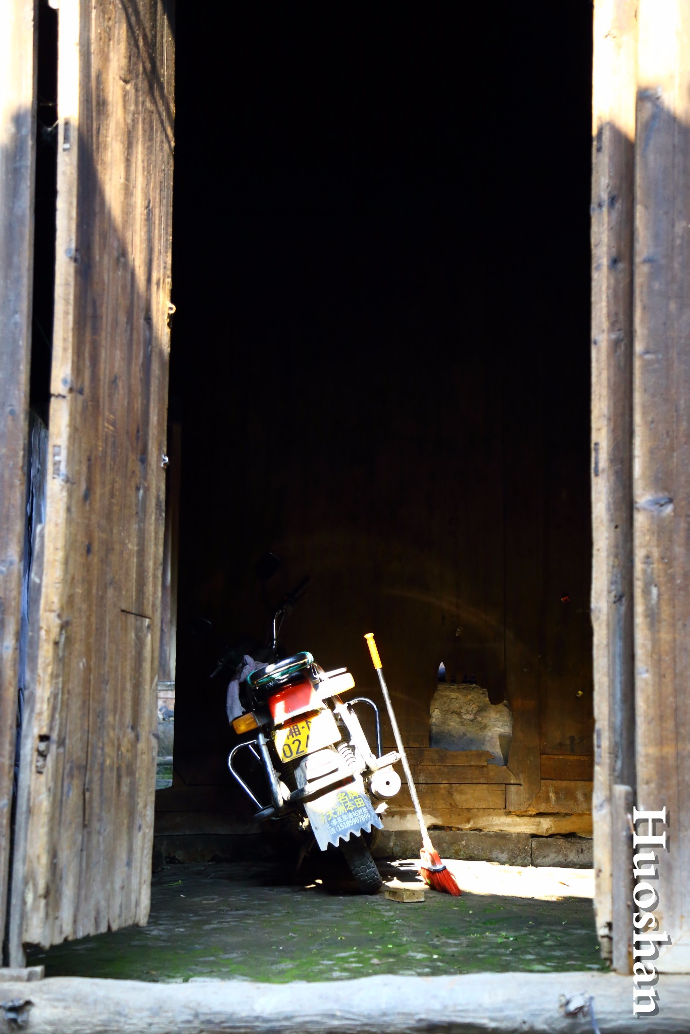 古朴木门里的摩托车,便捷的现代化交通工具早已进入了小镇家庭。
