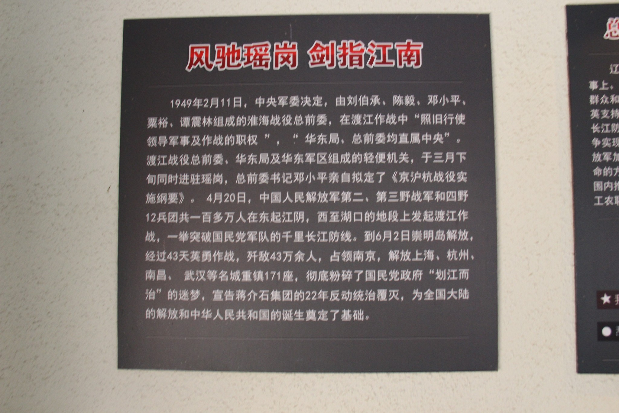 ,共分九个部分:总前委旧址、中共中央华东局旧址、总前委参谋处旧址、机要处旧址、秘书处旧址、后勤处旧址、警卫营旧址、医院旧址和《渡江颂》书画展厅。纪念馆现有实物、图片(表)700余件,以及将帅题词、书画作品108幅,党政领导题词36幅。1996年这里成为第四批全国重点文物保护单位。