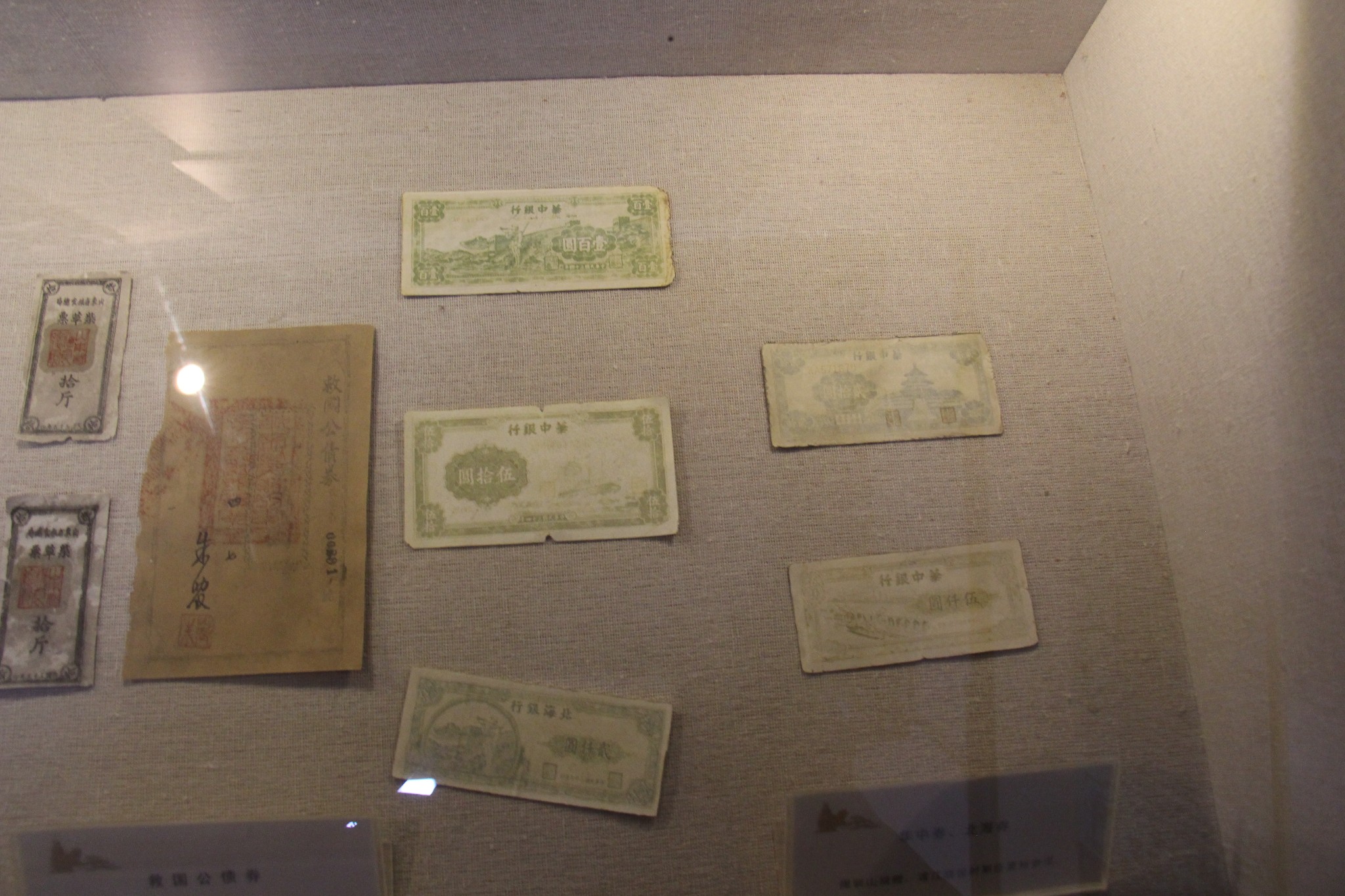 解放区使用的货币。当时已经有了第一套人民币,但是因为有些解放区很晚才和其他解放区连成一片,因此直到1949年初,有些就解放区比如苏北,还在使用华中解放区的货币。当时这种华中币的印刷和防伪都比较简陋,主要是使用暗记来防伪。我爷爷在抗战后期也曾经是华中银行印钞厂的一员。