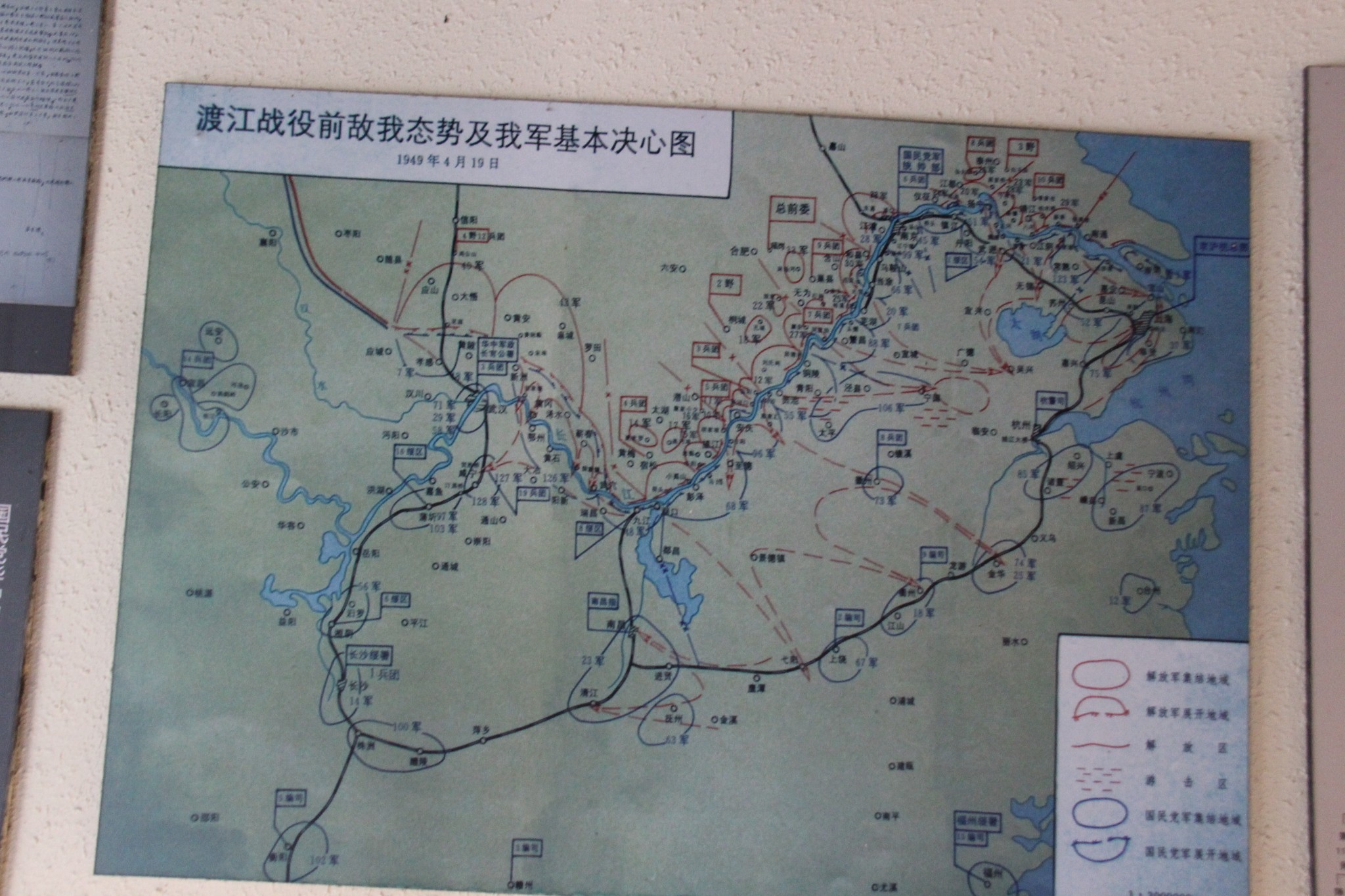 国军分为汤恩伯(上海到江西湖口45万人)白崇禧(九江到宜昌25万人)两大集团想以劣势兵力、海军(第二舰队)、江防要塞守住长达1000多公里、极易被重兵突破的长江,若江防被突破就转移至上海和浙赣铁路沿线抵抗。其中上海到南京江面防守的国民党军队数量多,装备也好。而从马鞍山到湖口段,国民党守军数量和装备都比南京以东弱。