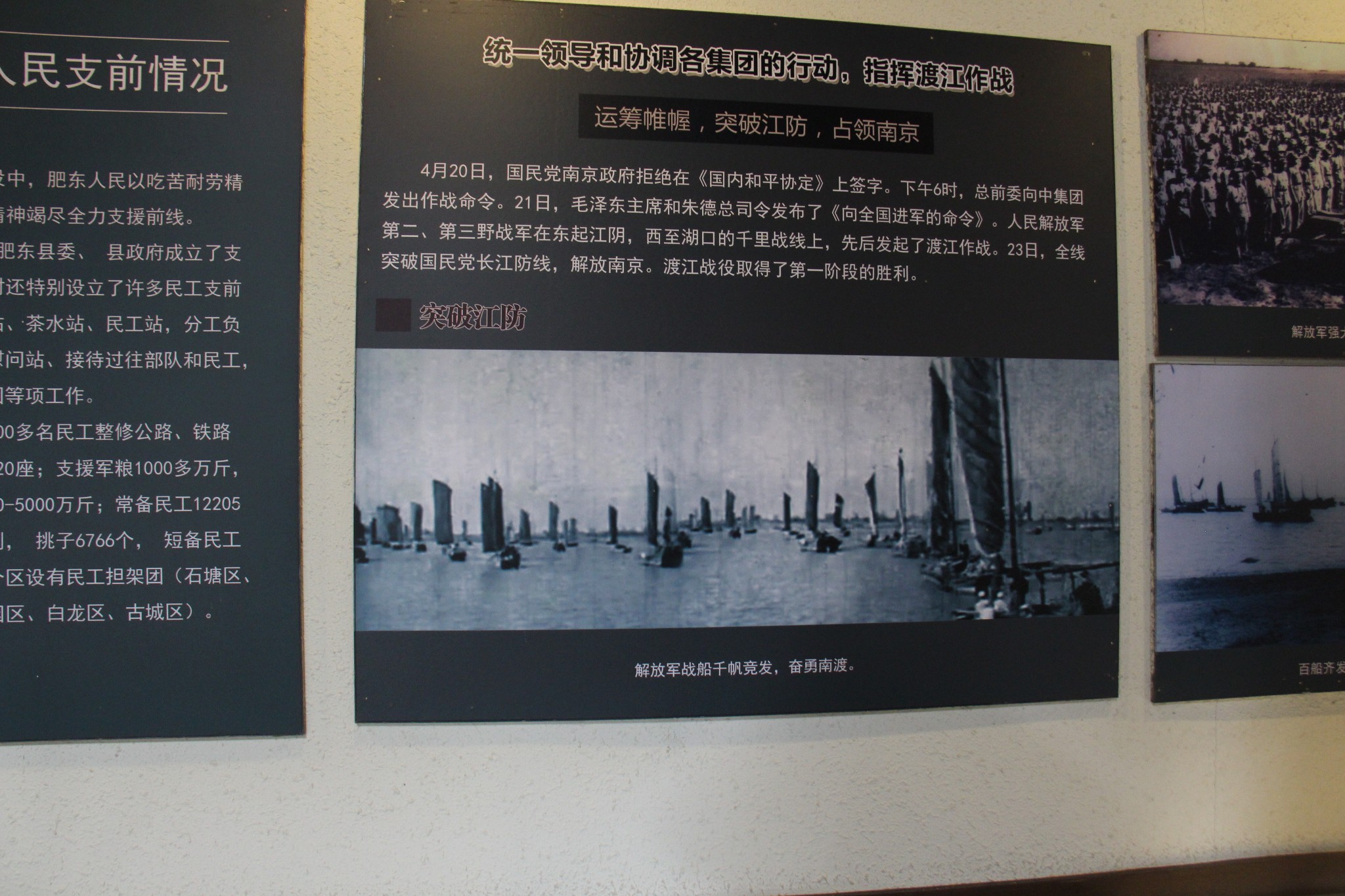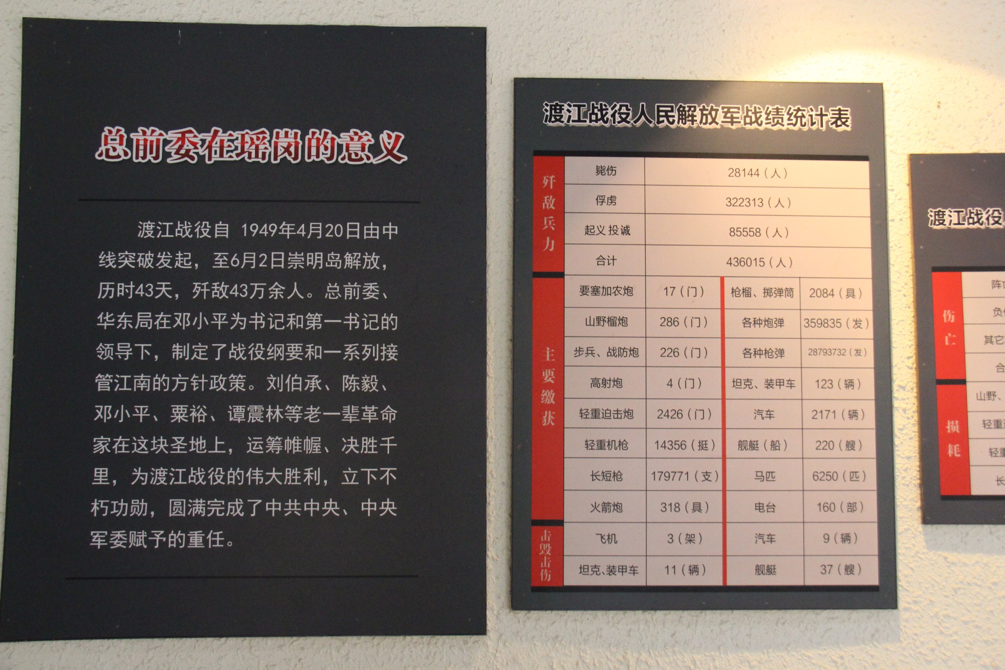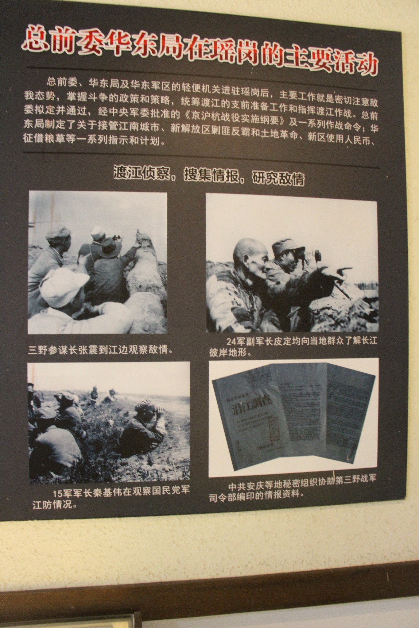 这座青砖小瓦、风火高墙四合院就是总前委参谋处旧址。它建于清朝末年,原为村中张氏家族的一处支祠(家族中一支的祠堂)。参谋处现在为渡江战役及解放战争期间部分珍贵革命文物展厅,这里收藏并陈列着渡江战役及解放战争期间的各种枪支、枪套、斧头、报刊、肩章、被褥和各种生活用品,以及曾经在这里工作过同志的回忆录和渡江战役纪念馆工作人员对他们的访谈录。 渡江战役参谋处旧址。