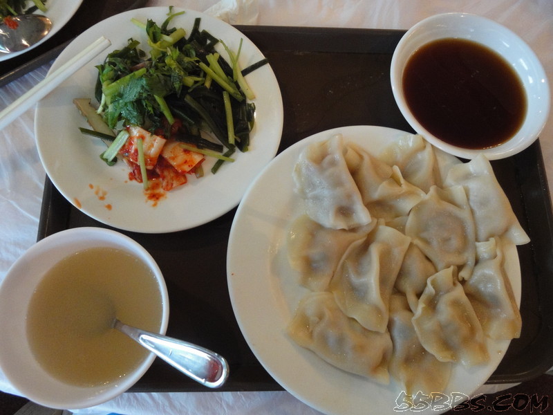 上船的第一顿午饭是饺子,进餐厅后给工作人员一张餐票,排队取托盘,往前走,两个工作人员一个乘饺子,一个乘汤,然后自己找地方坐下吃饭,吃完后再自己把托盘送到指定的桌子上,工作人员少,所以大家要自觉把托盘送回去。一般来说在不吃饺子的时候都是2-3种小菜+泡菜+米饭+汤,汤基本是清汤,米饭大清早都有,吃不饱时可以汤泡饭,泡菜是每顿必有的,韩国特色,我是真不爱吃那玩意儿,小菜的量很少,每种就是一小把——工作人员戴个透明手套抓的两小把,凑一起也只有1小盘,菜不够可以再添的。