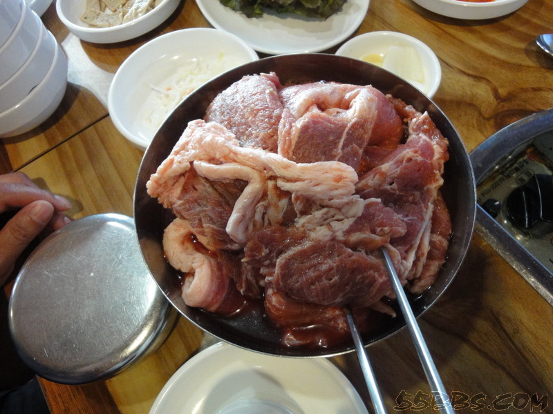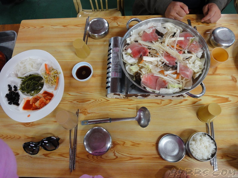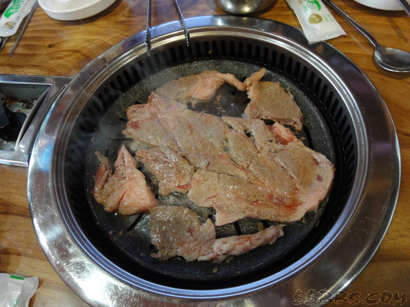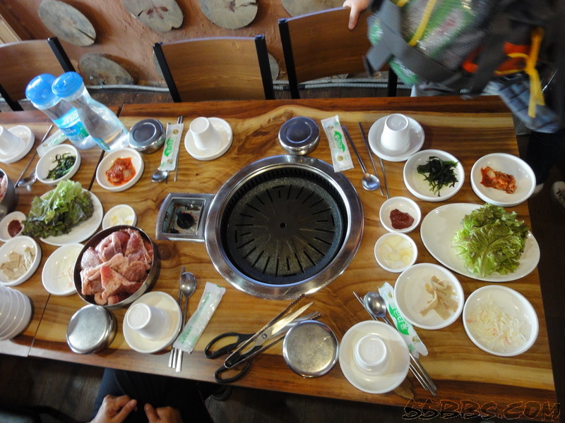 11:00上车去吃午饭,烤肉哦~韩国的食品全是从欧盟进口,安全卫生,但是牛肉是从美国进口,所以全世界最贵,好的牛肉一斤要1000美元~!!兼于此,我们这次所吃到的肉全是猪肉,韩国的猪肉全是又厚又大的大猪肉片子,而且完全没味儿,没调料。一般我们吃过的肉是不能续的,但是这家的是可以续的哦,吃的好爽~