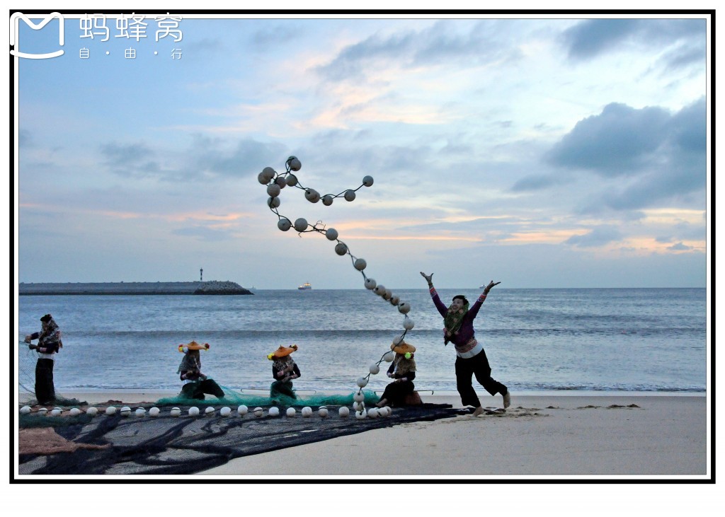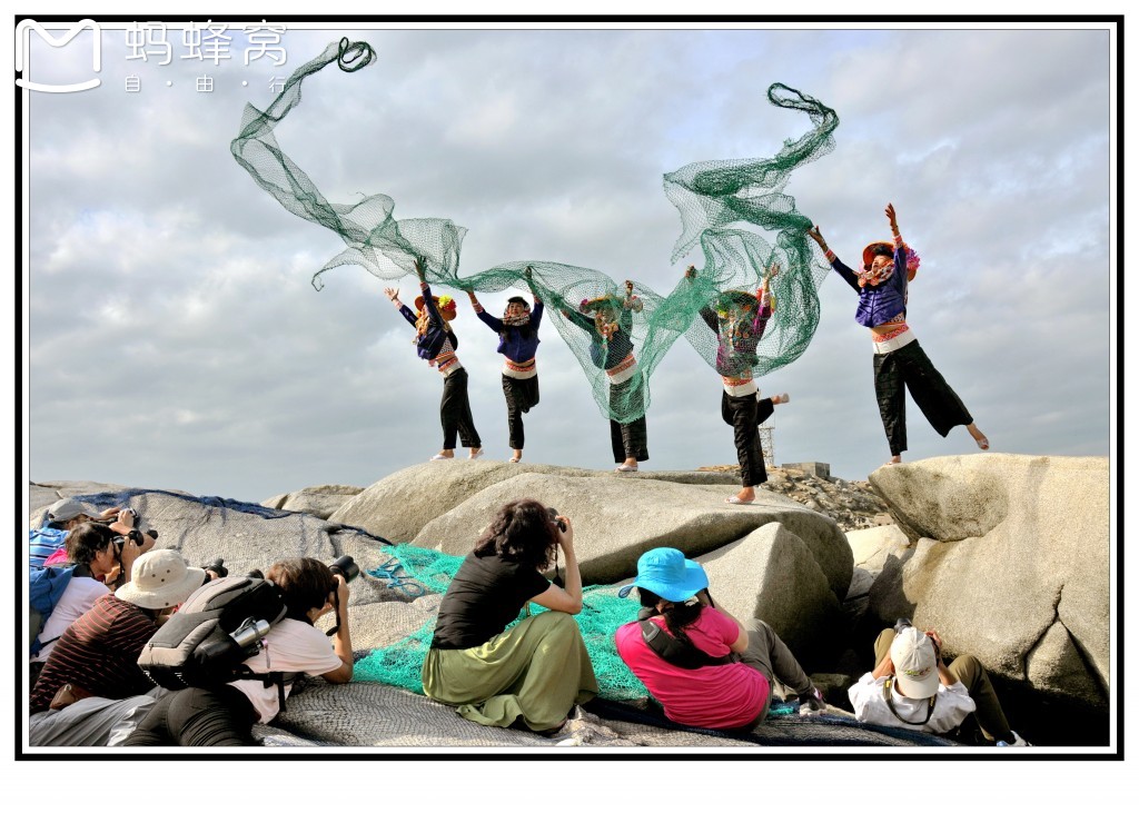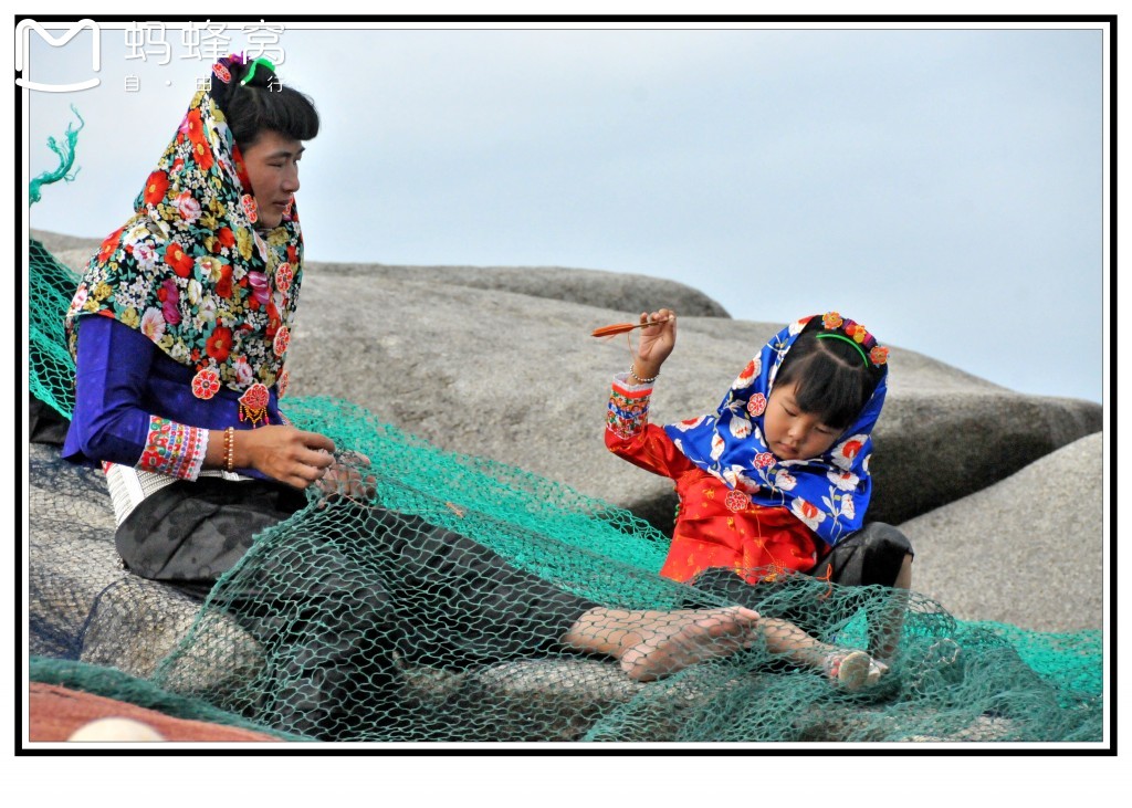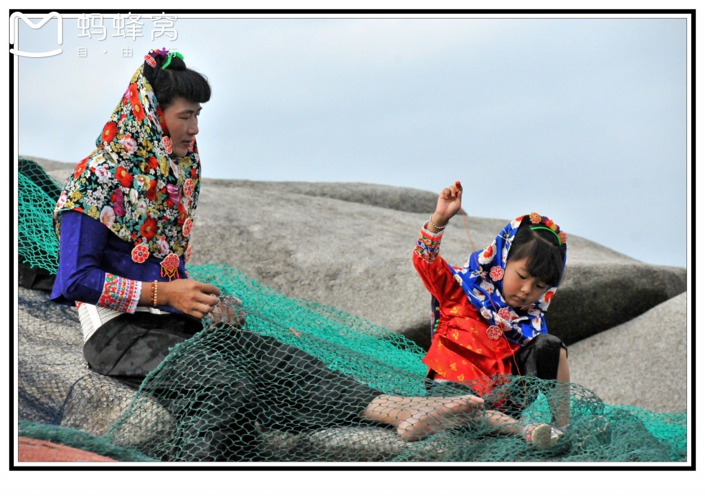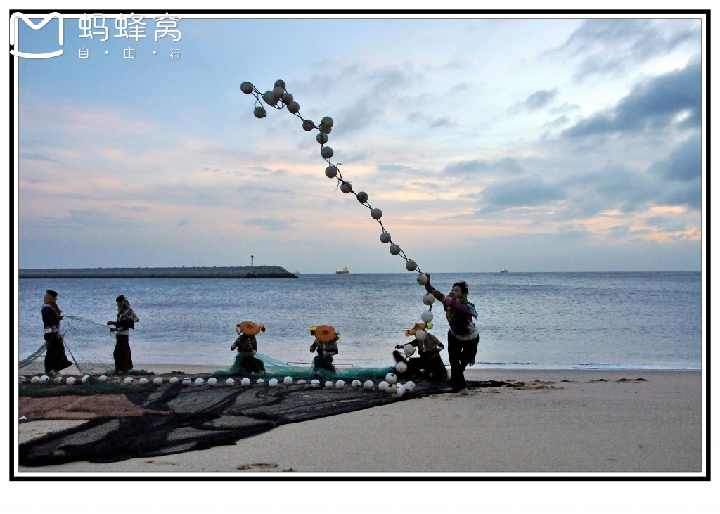 在海边摆拍惠安女编织魚网,天色一会就黑了。