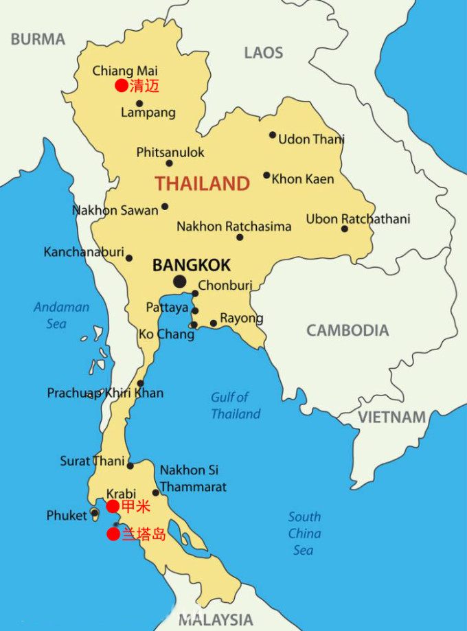 (泰国地图,行程从北方的清迈到南方的甲米)▼