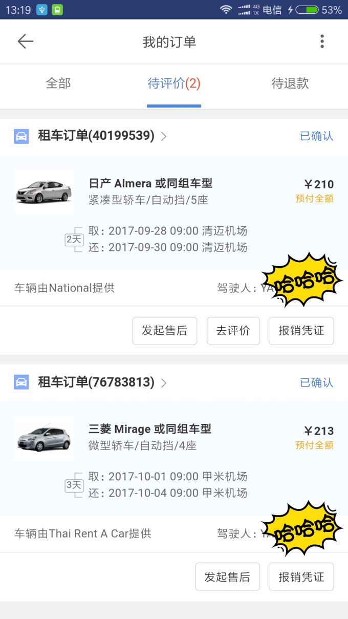 租车是通过租租车网站预订车辆的。总共预订5天,清迈2天,甲米3天。正好赶上交行和租租车网活动,用交行信用卡减掉了400RMB!! 5天租车费共423RMB,车险100RMB。非常划算,另外车险还是要买的,毕竟在境外安全第一,避免车损带来的麻烦。