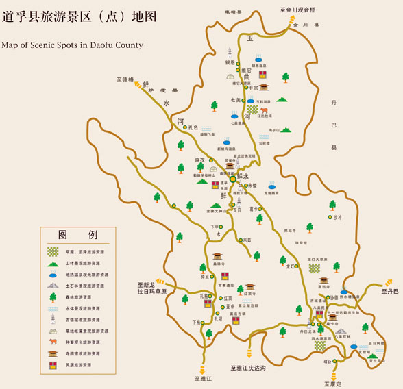 巴塘县县城海拔不高,2000多米使得县城有“高原江南”的美誉。巴塘也是名副其实的水果之乡,盛产石榴、核桃、西瓜等等。当地的美食有团结包子、长寿面、野生菌汤等。团结包子一个包子就是一笼,馅儿为土豆片、牛肉、青椒等等,面筋劲道,味道鲜美。而长寿面同样是如此,巴塘的面食在藏区十分出名,部分做法似乎与北方面食类似。巴塘县城住宿条件良好,条件最好的为雪域扎西、迎宾楼等几个宾馆,而其他招待所和宾馆也比较多。措普沟景区的措拉乡、茶洛乡均属于民居接待范畴,接待能力一般,而措拉乡之前318国道分岔口附近却有不少招待所。