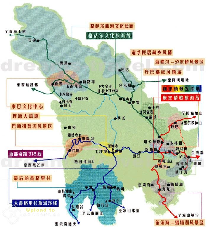 在成都沿318国道西行,到达“雨城”雅安,过天全线后,路况转坏,旅行者需小心,通过二郎山隧道后,再过泸定桥即到达康定。康定到新都桥全程为柏油路。